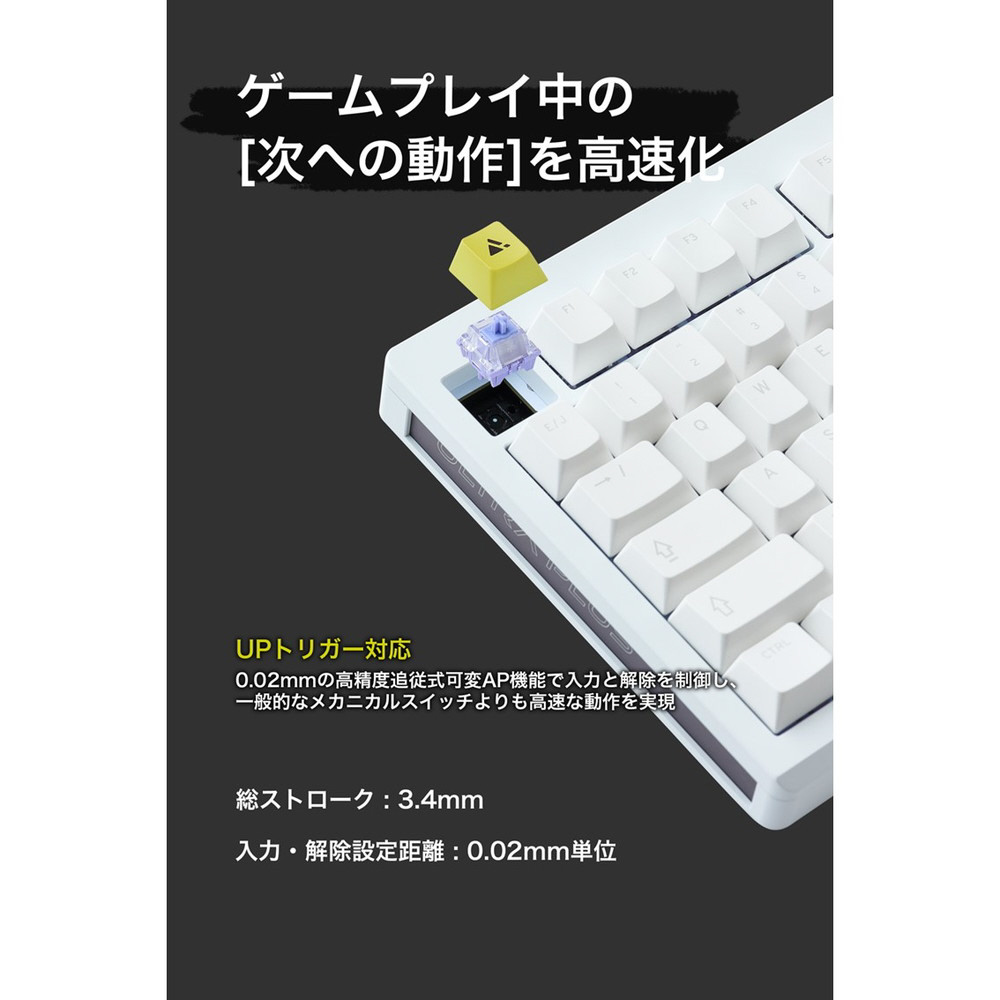 キーボード=入力機器の原点というコンセプトを踏襲しつつ、UPトリガー(高精度追従式可変アクチュエーションポイント機能)を新たに追加、カスタマイズされたオリジナル磁気スイッチはキースイッチの精度を高めることで、磁気スイッチでもメカニカルライクな心地よい打鍵感を提供します。