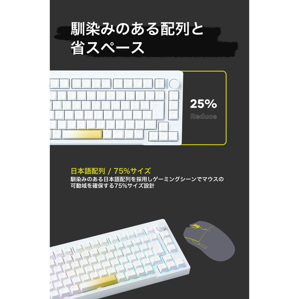 付属品 | USB Type-C ケーブル(1.8m) キーキャップ・キースイッチプラー(一体型) 交換用キーキャップ(ESC、スペース) ユーザーガイド(製品保証書付) 予備スイッチ 1個 |