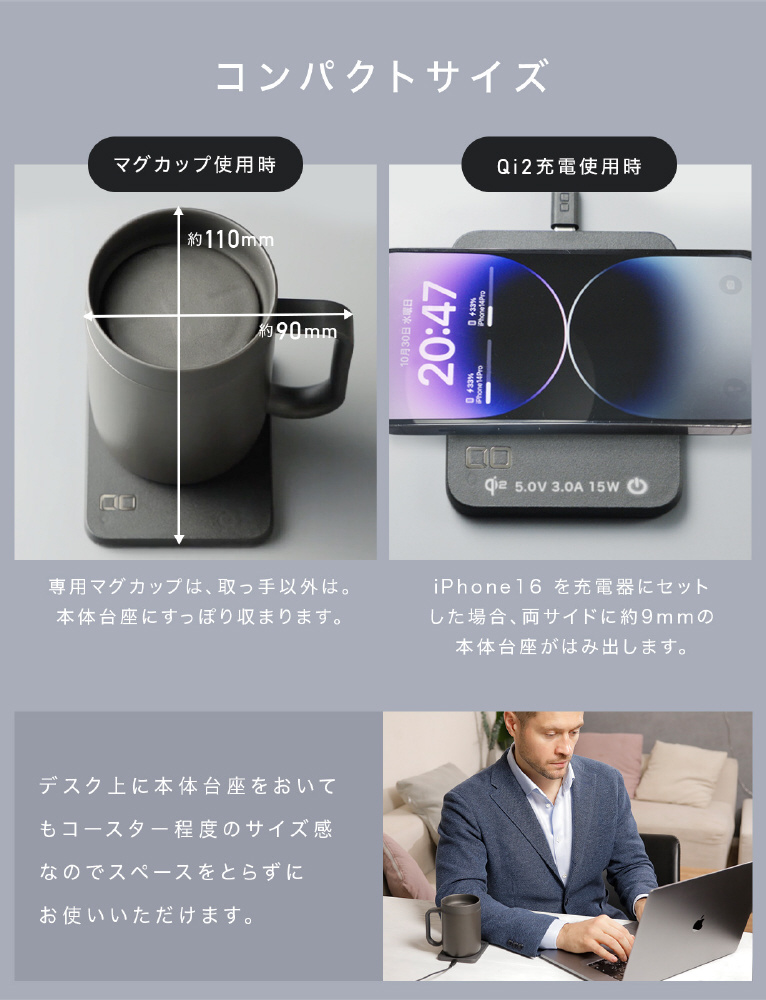 オフィス周りの新定番。温かい飲み物とQi2充電をこれ一つで。