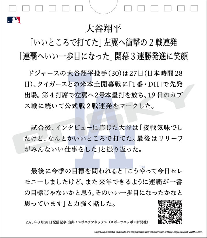 カレンダー31日万年日めくり 大谷翔平 第二章
