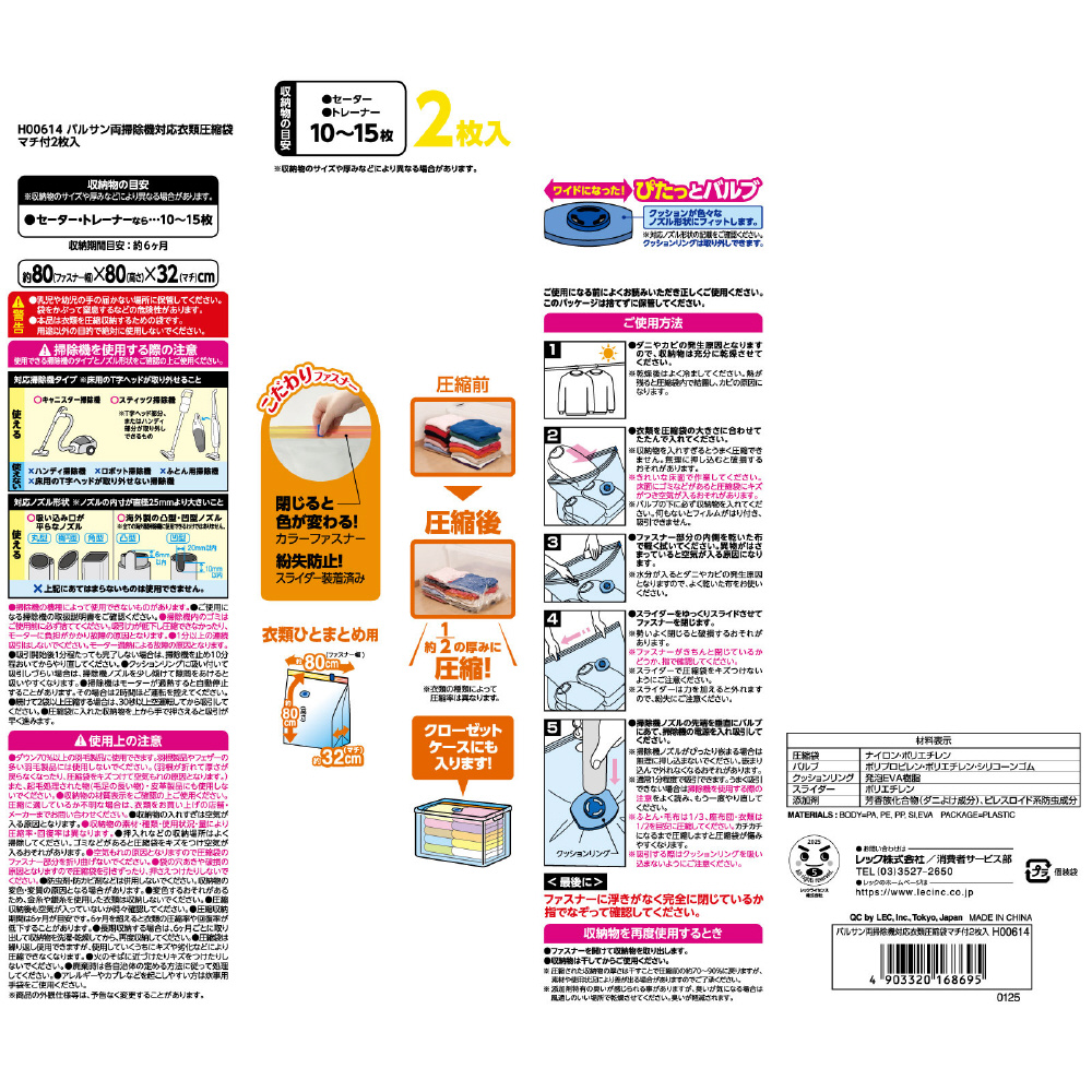 収納物の目安 ●セーター ●トレーナー 10?15枚 ※収納物のサイズや厚みなどにより異なる場合があります。  キャニスター・スティック掃除機対応 ダブルパワー ダニよけ&防虫 どちらの掃除機も対応 ワイドなクッションでフィット! 衣類ひとまとめ用 マチ付き 約80(ファスナー幅)×80(高さ)×32(マチ)cm