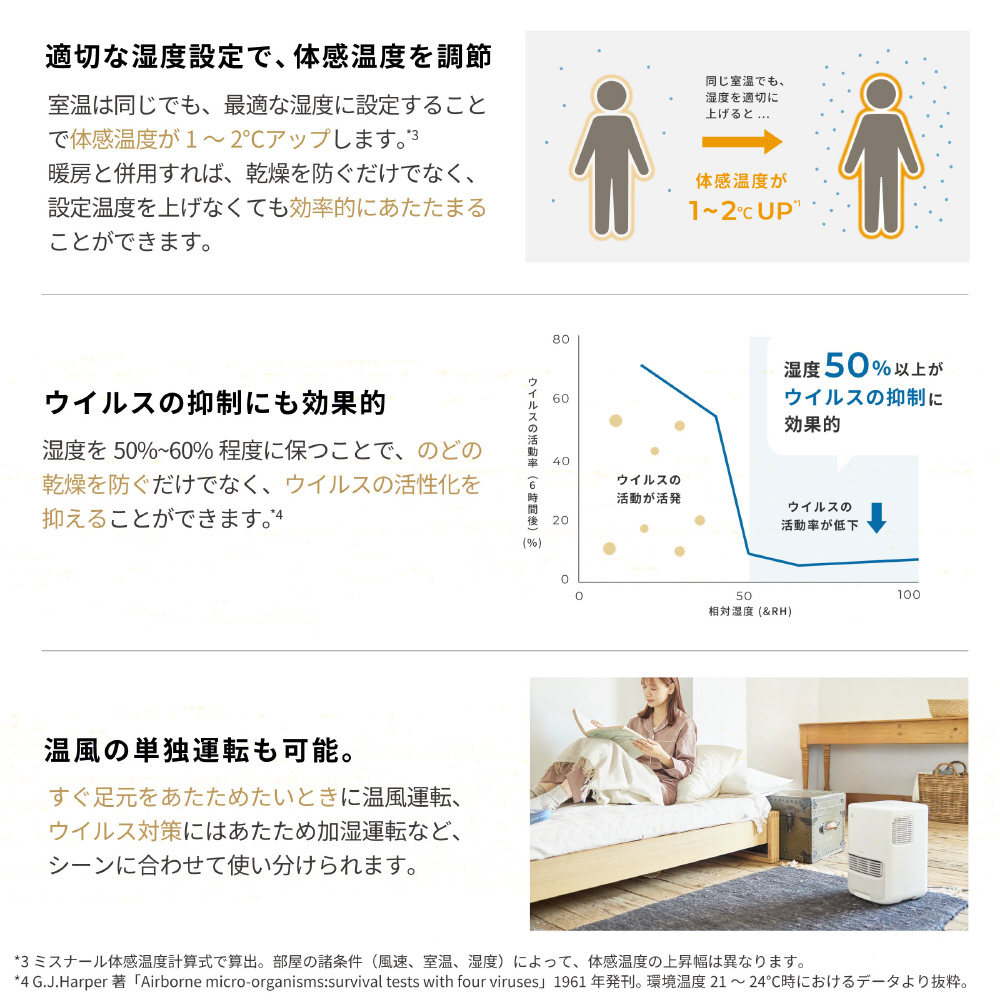 リモコンには湿度センサー付き。40・50・60%の3段階で湿度設定が可能で、リモコンを自分のそばに置いておくことで、周囲を設定した湿度に保って運転します。本体の風道の構造を工夫し、温風の通り道と加湿された風・温風の通り道を別にすることで、あたためを止めることなく同時に加湿量をコントロールし続けることを可能にしました。湿度を50%〜60%程度に保つことで、乾燥を防ぐだけでなく、ウイルスの抑制にも効果的です。