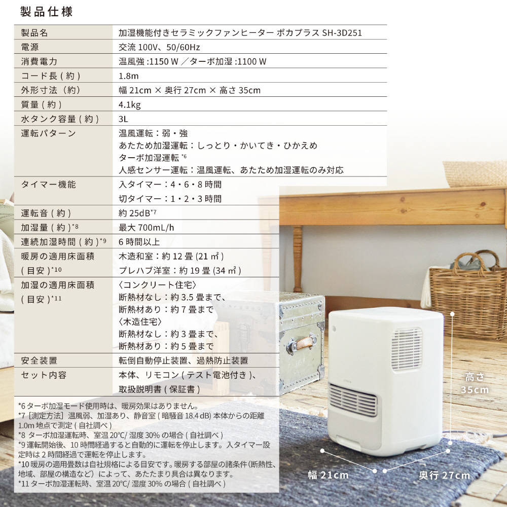 | 商品名 | 加湿機能付き セラミックファンヒーター ポカプラス SH-3D251 |