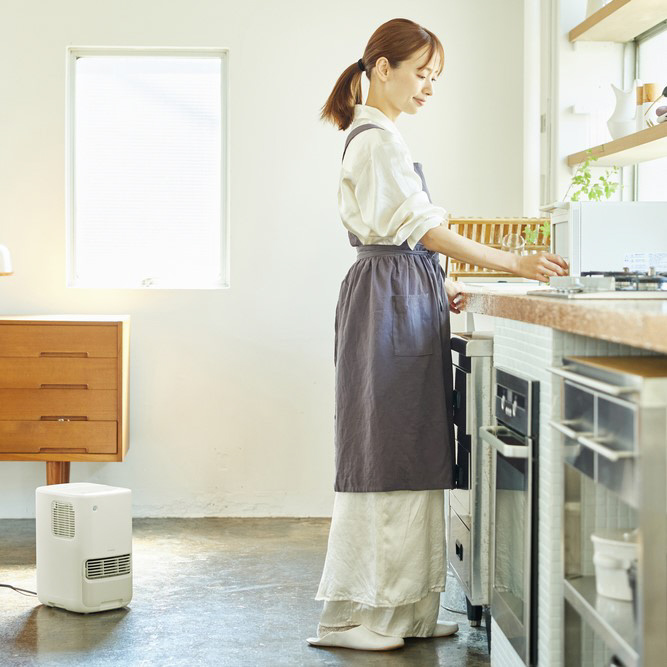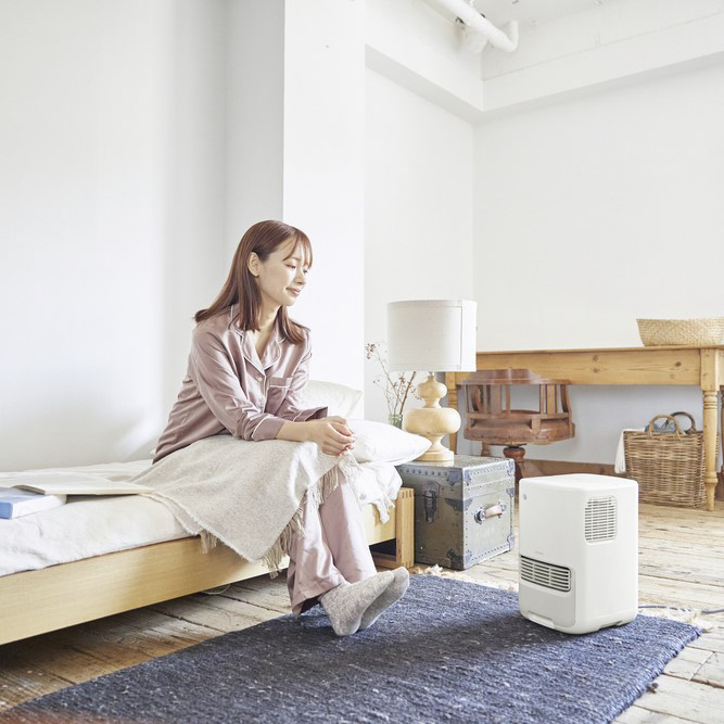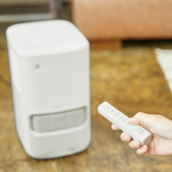 コンパクトサイズながら、セラミックファンヒーターと温風気化式加湿器がひとつに。あたためながら加湿して乾燥を防ぐことはもちろん、湿度センサー付きのリモコンで湿度のコントロールもでき、シーンに合わせて快適な空間作りをサポートします。