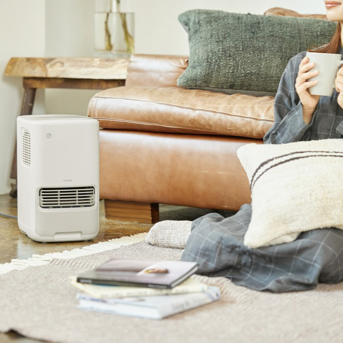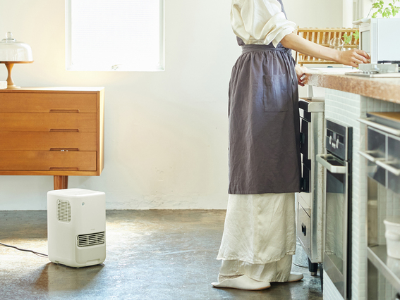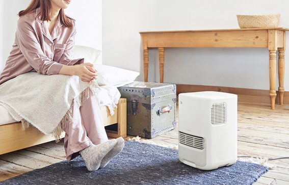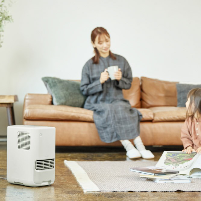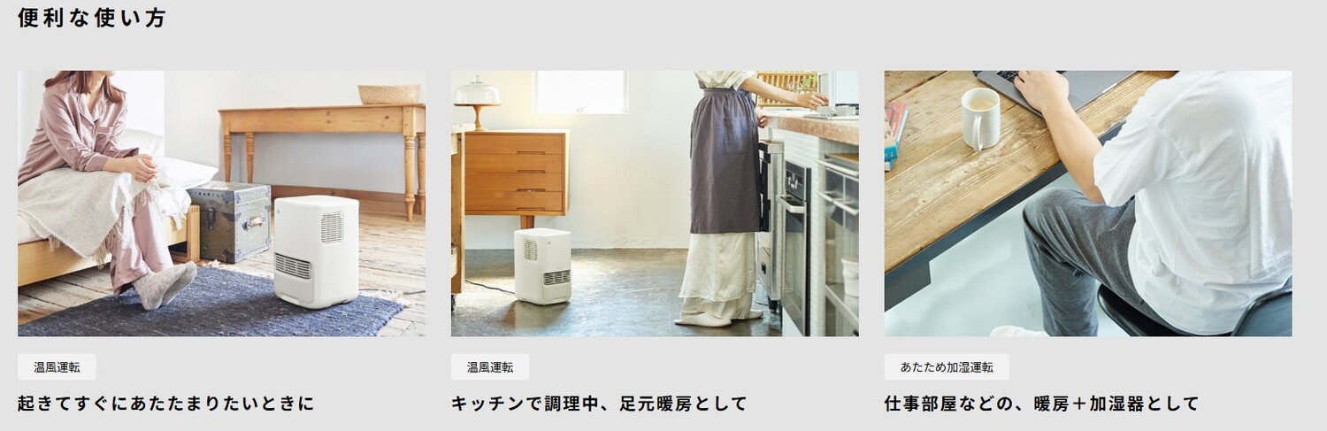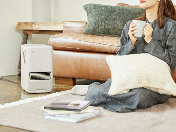 セラミックファンヒーターと気化式加湿器がひとつになった、あたためも加湿もできる製品。あたためながら加湿して乾燥を防ぐことはもちろん、湿度センサー付きの「湿度リモコン」で湿度のコントロールもできるため、シーンに合わせて快適な空間作りをサポートします。