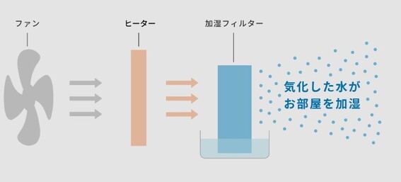 フィルターに浸透した水をヒーターで温めたファンの風で気化させる、温風気化式を採用。