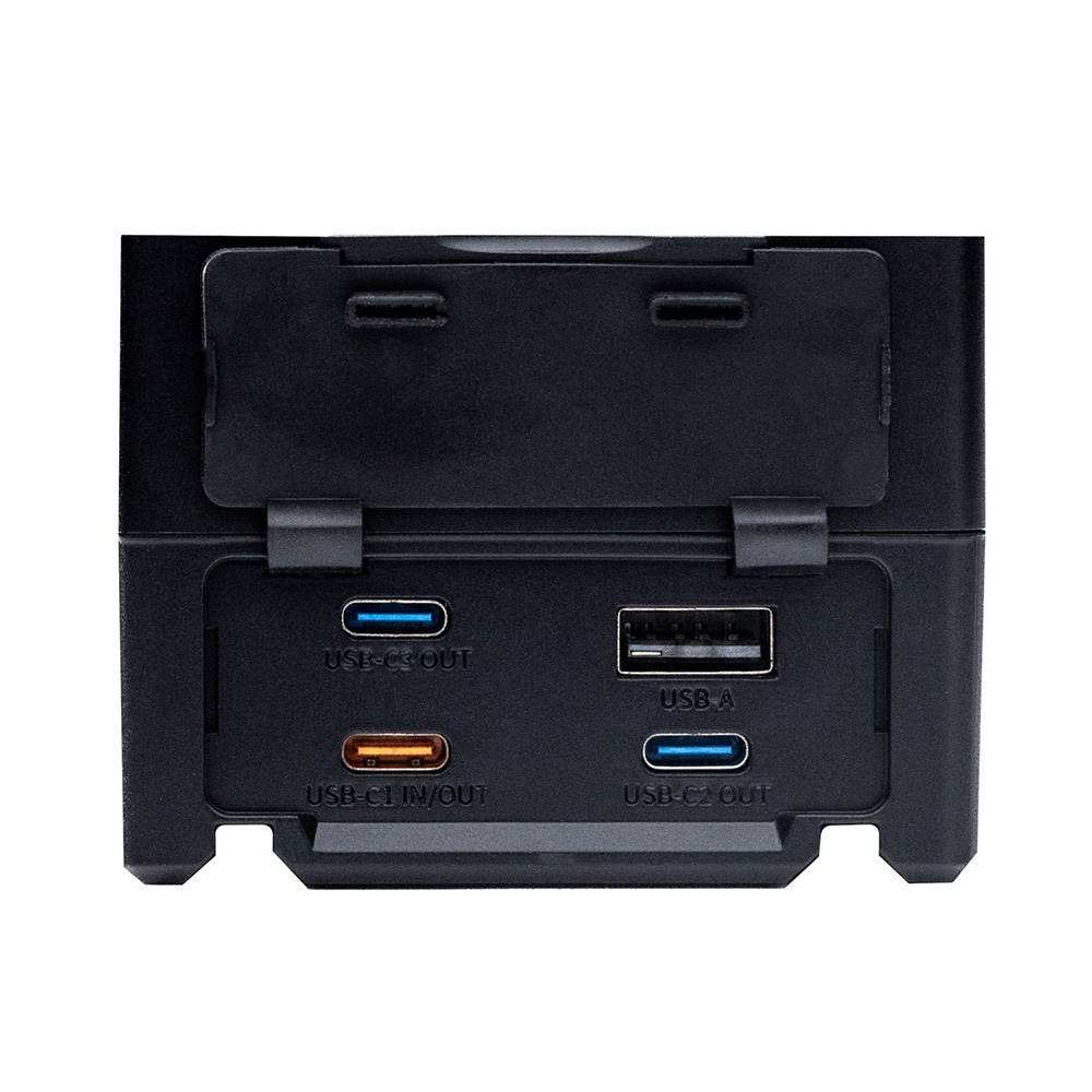 Vマウントの他、D-Tap×2やUSB-A、USB-C×3などの端子を装備。この柔軟性の高さは、現代の制作環境における究極の電源ソリューションと言えます。また、Vマウントには1/4および3/8のネジ穴を設けており、プロ仕様アクセサリーの様々な取り付けに対応します。
