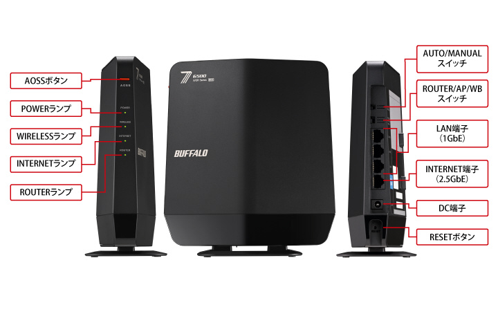 ※INTERNETポートをLANポートとして利用する場合は、AUTO/MANUALスイッチをMANUALにし、ROUTER/AP/WBスイッチをAP/WBにしてご利用ください。