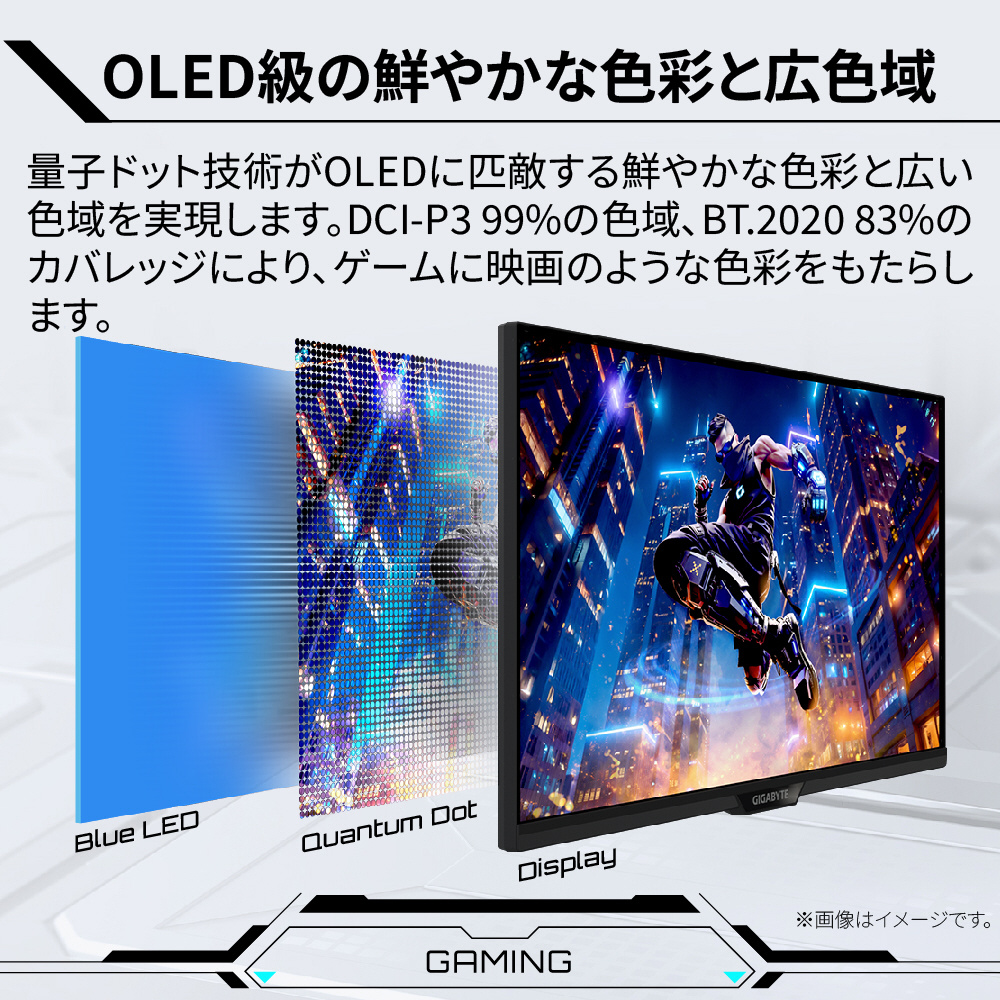 量子ドット技術を搭載するM27Q2 QDは、OLEDに匹敵する鮮やかな色彩と広い色域を実現し、長寿命の性能をあわせ持ちます。GIGABYTEのOLEDモニターと同等のDCI-P3 99%の色域、BT.2020 83%のカバレッジは、最新の第4世代WOLEDの84%カバレッジに迫る性能で、ゲームに映画のような色彩をもたらします。