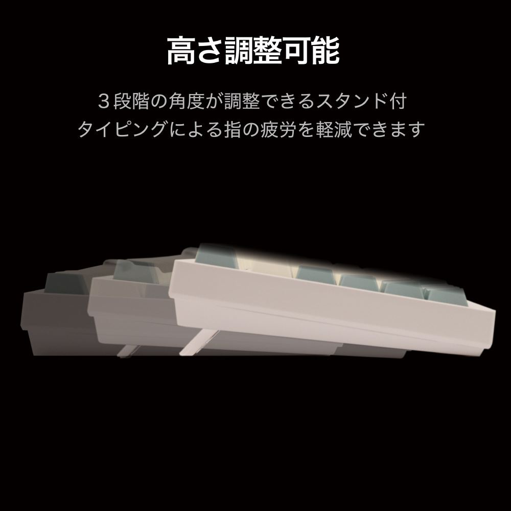 本製品は82キーの省スペース設計を採用しており、テンキーレスでデスク周りをスッキリさせたい方や持ち運びにも最適。