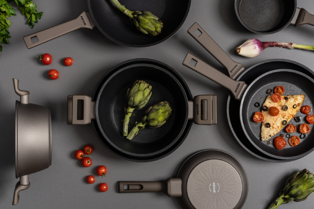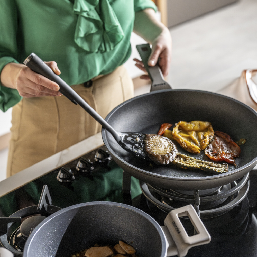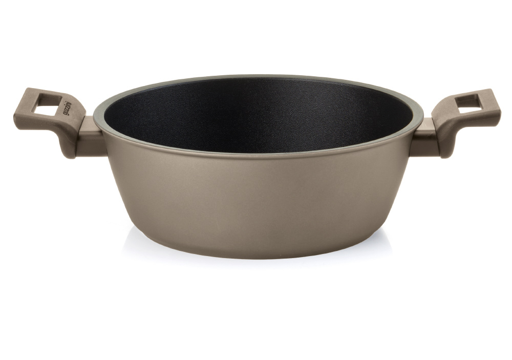 キャセロール。焼く、炒める、煮込料理もこれ1つで可能です。厚く、研磨されたアルミニウムボディは均一に熱伝導を分散させます。4層で粗めの高品質PTFEノンスティックコーティングにより、傷や摩耗に非常に強く、機能的なデザインとエレガントなブロンズ仕上げは洗練されたイタリアンライフスタイルを演出します。