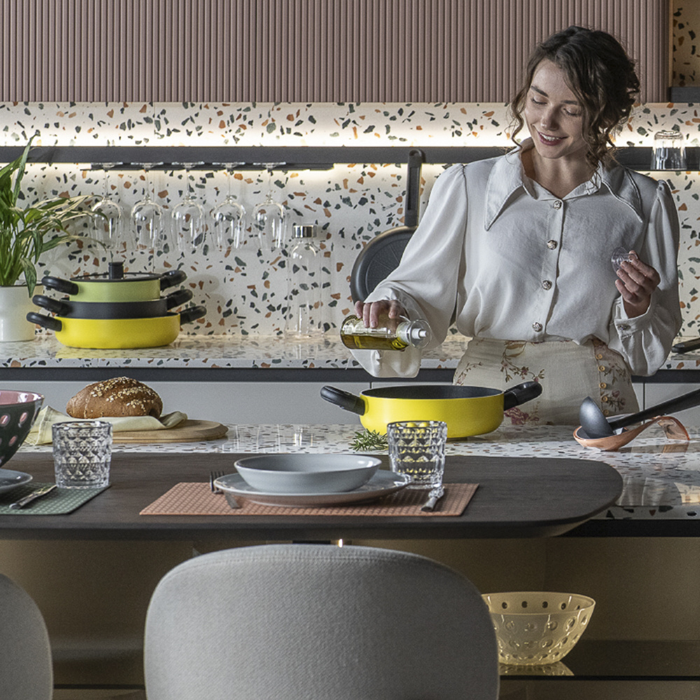 キャセロール鍋。焼く、炒める、煮込料理もこれ1つで可能です。SpalvieriDel Ciottoによってデザインされたコレクションです。3層インナーコーティング、高品質の焦げ付き防止コーティングが施されています。サンドブラストボディは鍋の寿命を延ばし、人間工学に基づいたモダンなハンドルで握りやすく使いやすい構造です。