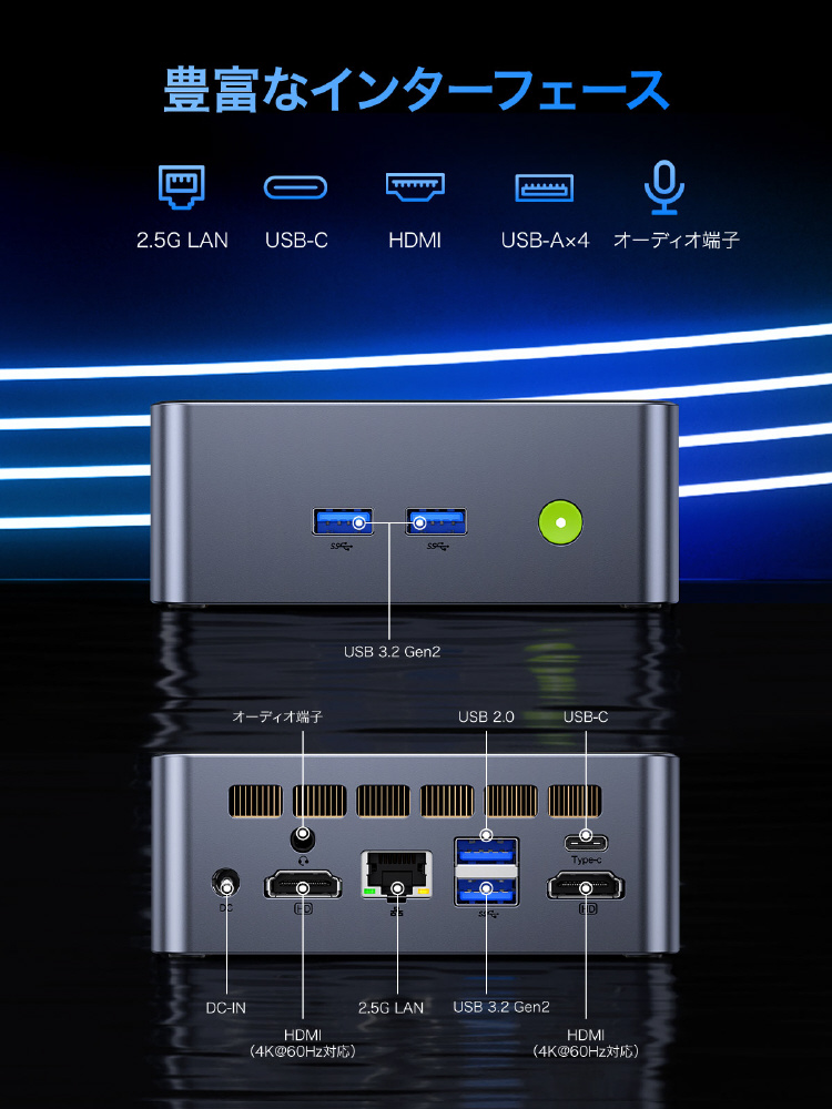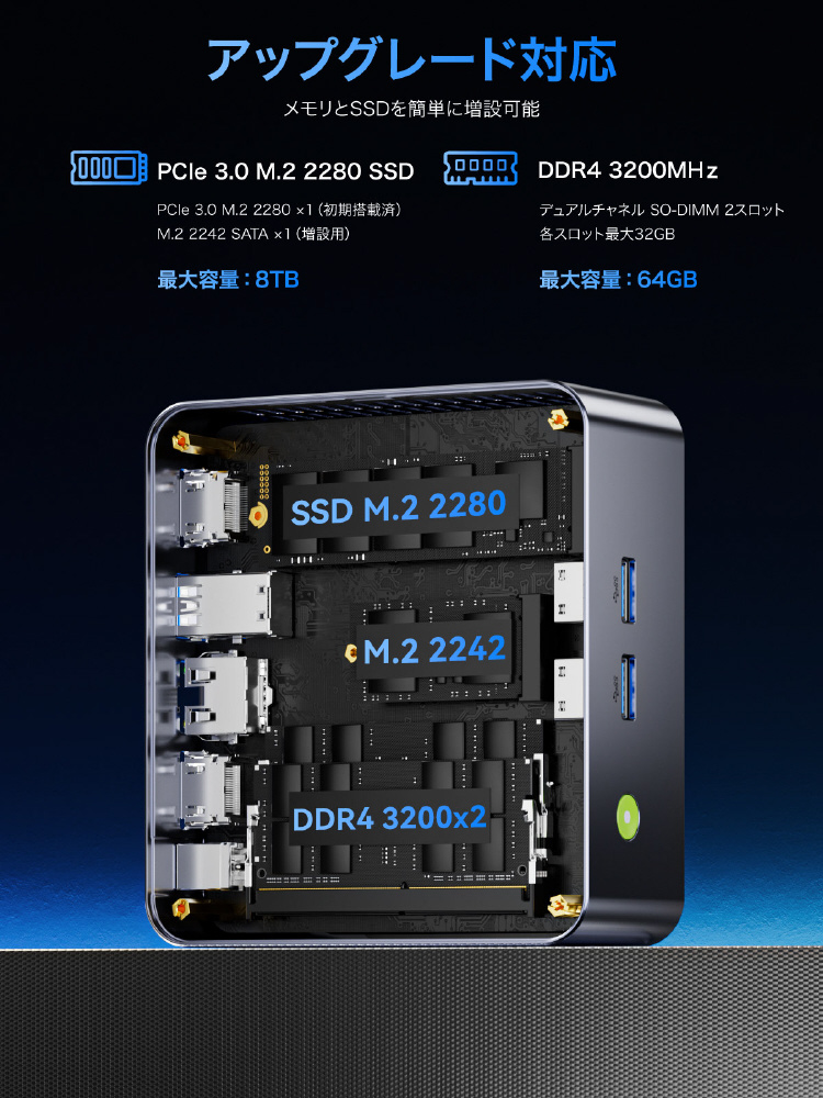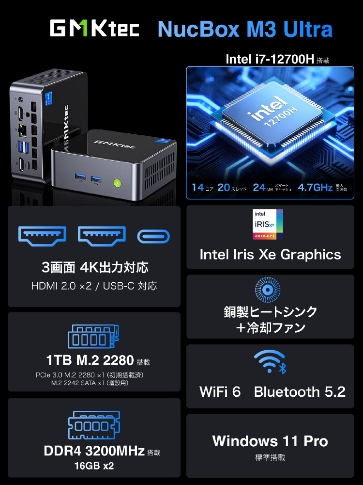 GMKtec NucBox M3 Ultraは、Intel Core i7-12700Hを搭載した高性能ミニPCです。14コア20スレッド、最大4.7 GHz動作の高性能CPUと32 GBの大容量メインメモリ、1 TBのM.2 PCIe 3.0 高速SSDを搭載することで画像や動画編集なども快適に行えます。