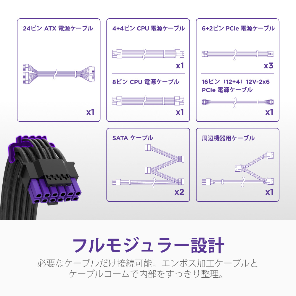 完全モジュラー設計で配線もスッキリ。12V-2×6コネクタを搭載し、最新GPUにも対応します。