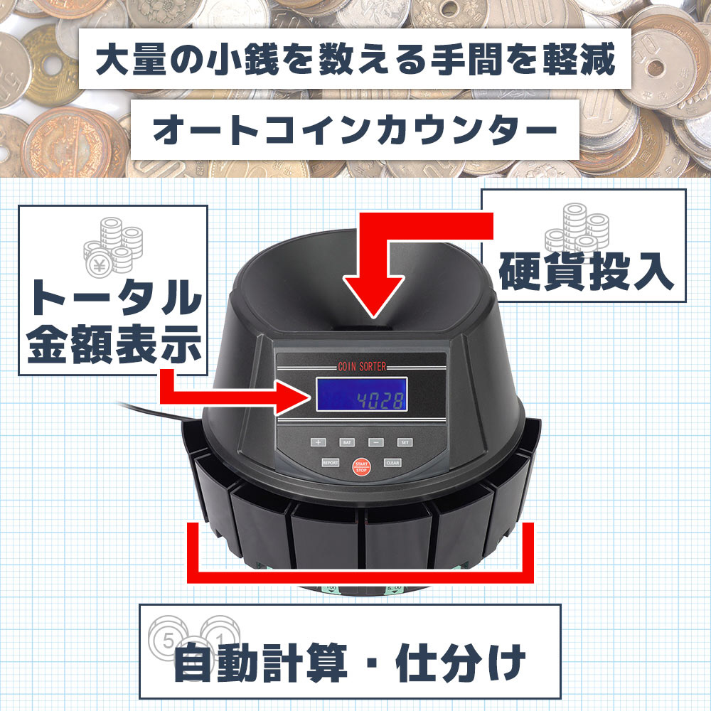 【新硬貨対応、硬貨を投入するだけで自動で選別、計算を行う電動コインカウンター】
