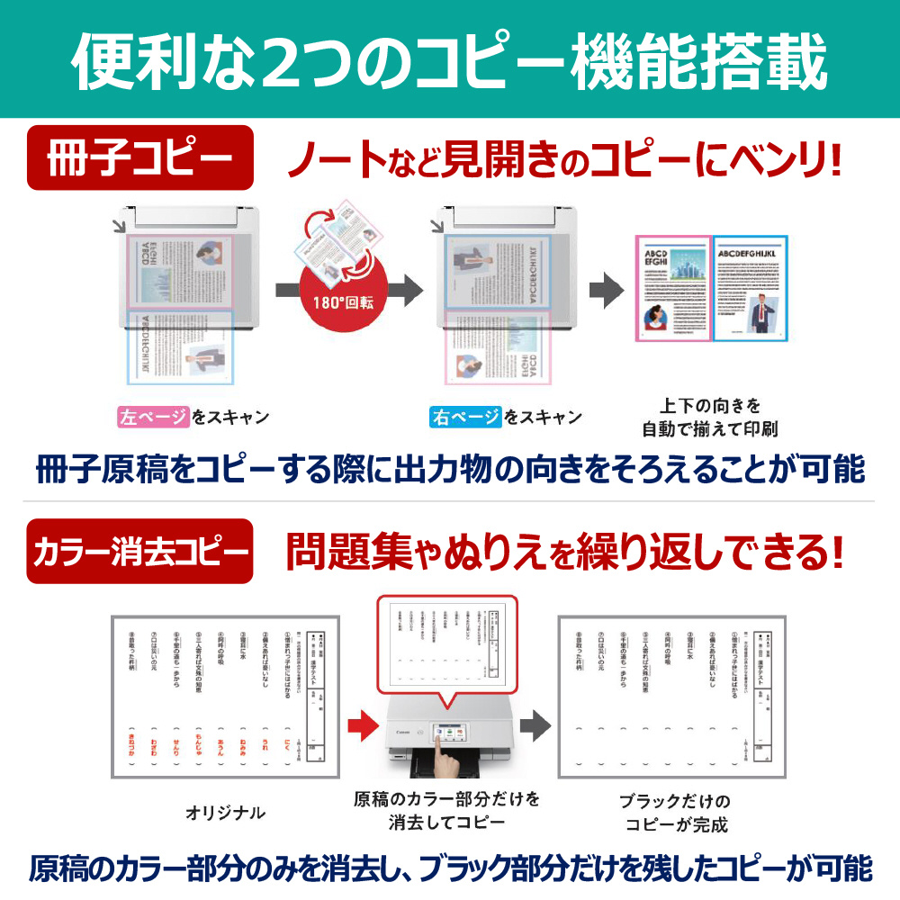原稿のカラー部分だけを消去しブラック部分だけを残したコピーが可能。問題集や塗り絵などの繰り返し学習などに便利です。