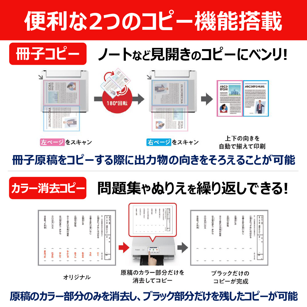 原稿のカラー部分だけを消去しブラック部分だけを残したコピーが可能。問題集や塗り絵などの繰り返し学習などに便利です。