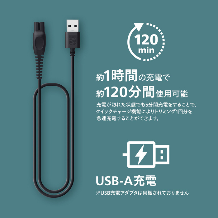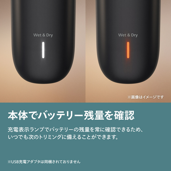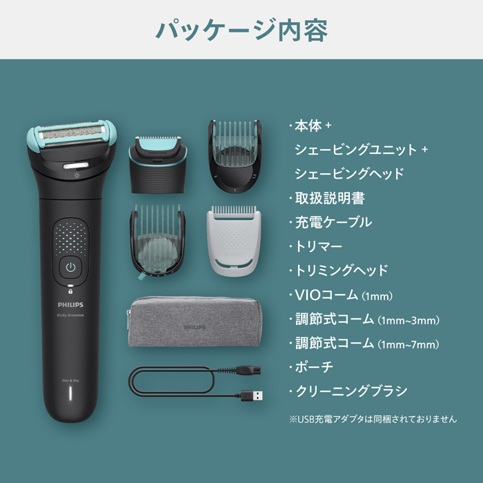| 付属品 | 取扱説明書、充電ケーブル、トリマー、トリミングヘッド、VIO コーム (1 mm)、調節式コーム (1 mm 〜 3 mm)、調節式コーム (3 mm 〜 7 mm)、ポーチ、クリーニングブラシ |