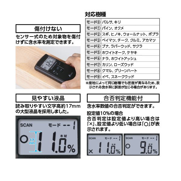 センサー式のため対象物を傷つけずに含水率を測定できます。