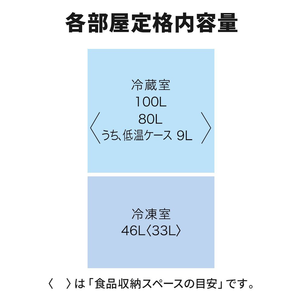 46Lの余裕の収納力でまとめ買いや作り置きもOK。上段はカップアイスなど背の低いものを、下段は500mLのペットボトル*や食パンなど背の高いものをすっきり収納することができます。