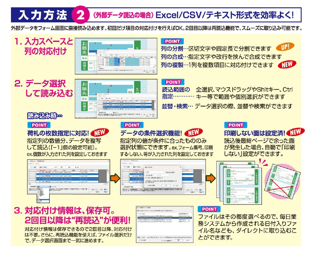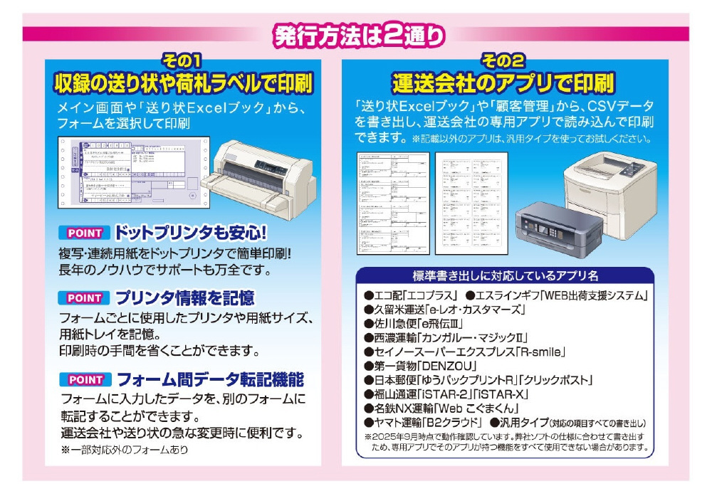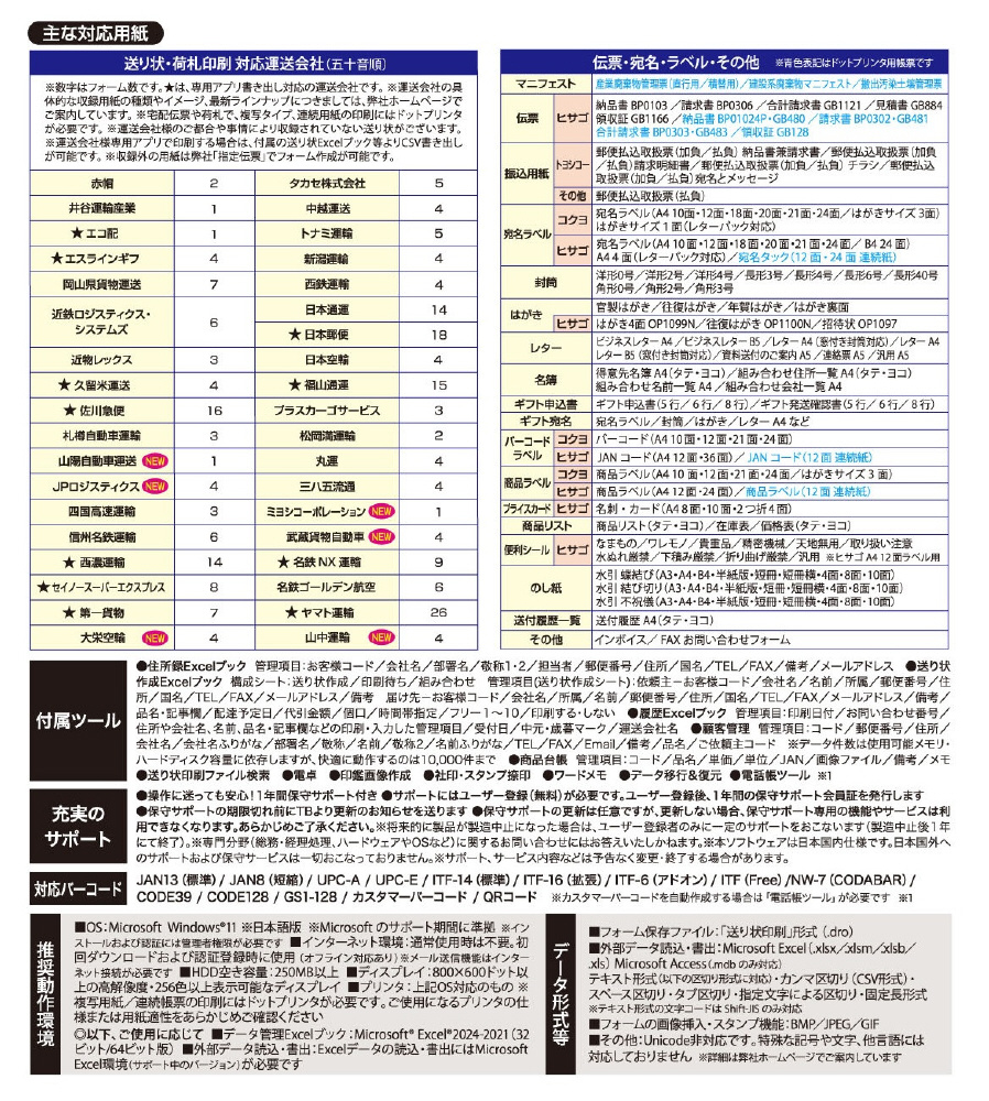 運送会社37社公認、約250種類の送り状・荷札フォームを収録。専用アプリ用CSV書き出し10社以上対応。