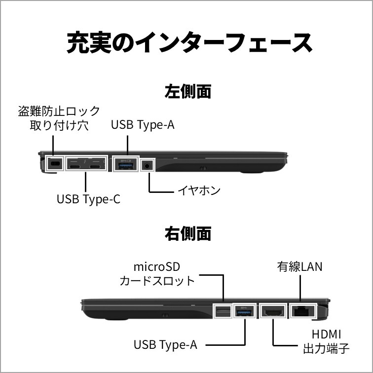 | インターフェイス | [ダイレクト・メモリースロット]microSDメモリーカード対応x1 [USB-C] Thunderbolt4 USB4 Gen3x2(USB Power Delivery対応、DisplayPort Alt Mode対応) [USB-A] USB3.2 Gen1x1 USB3.2 Gen1x1(電源オフUSB充電機能付) [映像入出力]HDMI出力端子x1 [LAN]RJ-45x1 [オーディオ]マイク・ラインイン・ヘッドホン・ラインアウト・ヘッドセット兼用端子x1(φ3.5mmステレオ・ミニジャック) |