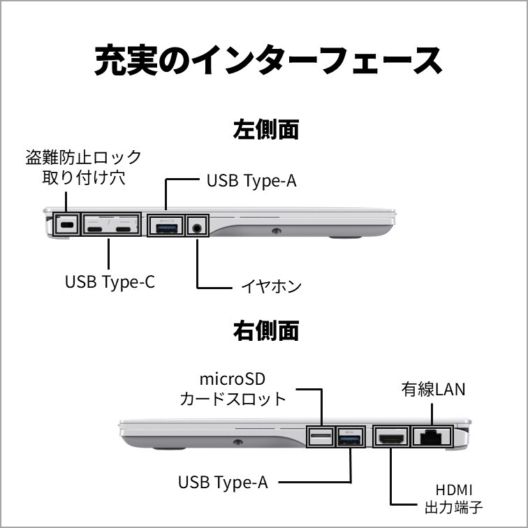 | インターフェイス | [ダイレクト・メモリースロット]microSDメモリーカード対応x1 [USB-C] Thunderbolt4 USB4 Gen3x2(USB Power Delivery対応、DisplayPort Alt Mode対応) [USB-A] USB3.2 Gen1x1 USB3.2 Gen1x1(電源オフUSB充電機能付) [映像入出力]HDMI出力端子x1 [LAN]RJ-45x1 [オーディオ]マイク・ラインイン・ヘッドホン・ラインアウト・ヘッドセット兼用端子x1(φ3.5mmステレオ・ミニジャック) |