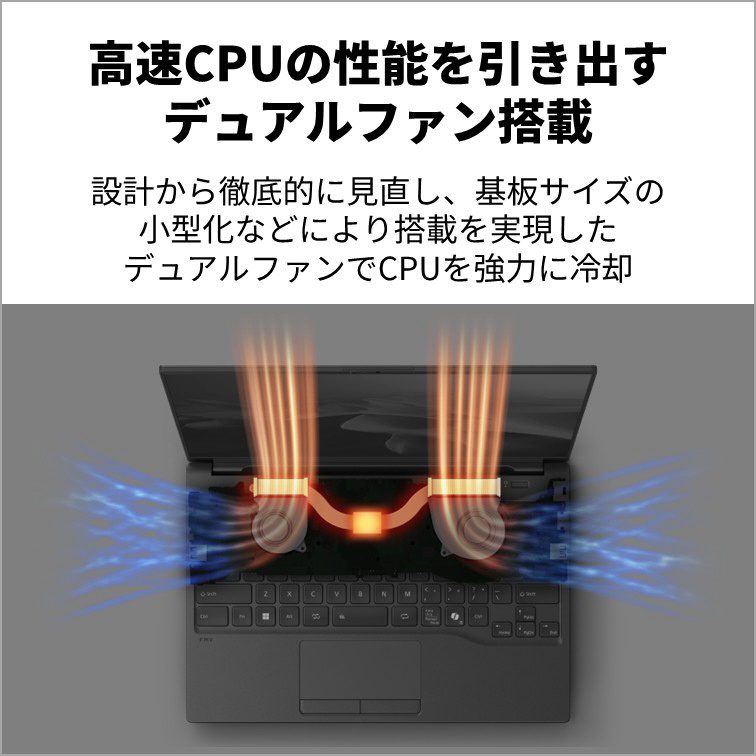 CPUを強力に冷却するデュアルファンを搭載することで28WのCore Ultra 7 155Hの性能を引き出し、より快適な作業を行えます。