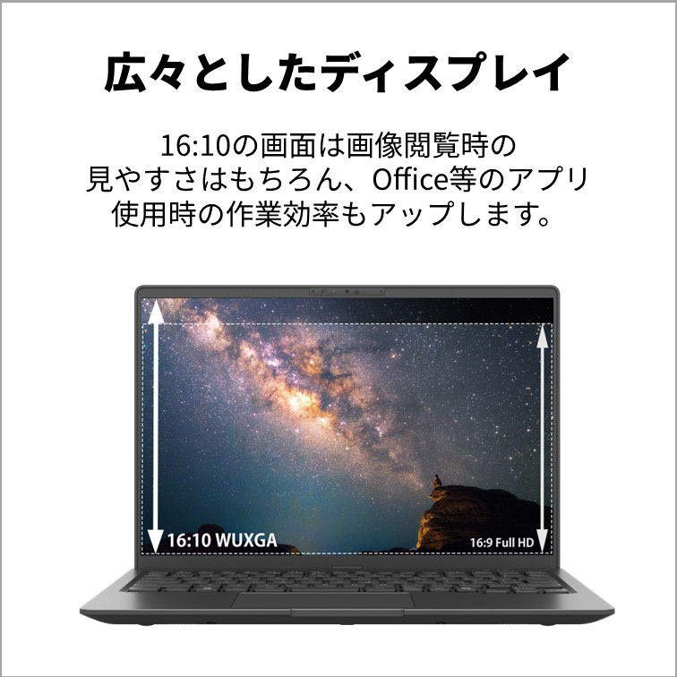 従来の縦横比16:9の画面よりも広い範囲を表示できる16:10の画面は、画像閲覧時の見やすさはもちろん、Office使用時の作業効率もアップします。