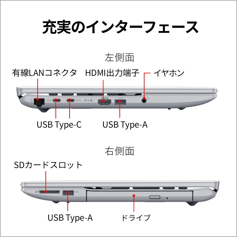 | インターフェイス | [ダイレクト・メモリースロット]SDメモリーカード対応x1 [USB-C] USB4(Gen3)x1 USB 3.2(Gen2)x1(USB Power Delivery対応、DisplayPort Alt Mode対応) [USB-A] USB 3.2(Gen1)x1 USB 3.2(Gen2)x1 [映像入出力]HDMI出力端子x1 [LAN]RJ-45x1 [オーディオ]マイク・ラインイン・ヘッドホン・ラインアウト・ヘッドセット兼用端子x1(φ3.5mmステレオ・ミニジャック) |