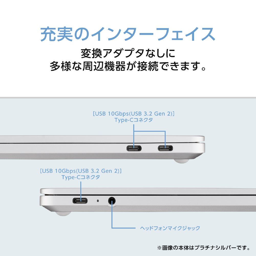 | 仕様1 | [内蔵ディスプレイ]13.3型ワイド スーパーシャインビューLED IPS液晶(広視野角・高輝度・高色純度・ノングレア)(WUXGA) [表示色 (解像度)]内蔵ディスプレイ:最大1677万色 (1920×1200ドット、1920×1080ドット、1680×1050ドット、1600×900ドット、1366×768ドット、1280×1024ドット、1280×720ドット、1024×768ドット、800×600ドット) [ワイヤレスLAN]Wi-Fi 7 (5.7Gbps)対応 (IEEE802.11be/ax/ac/a/b/g/n) |