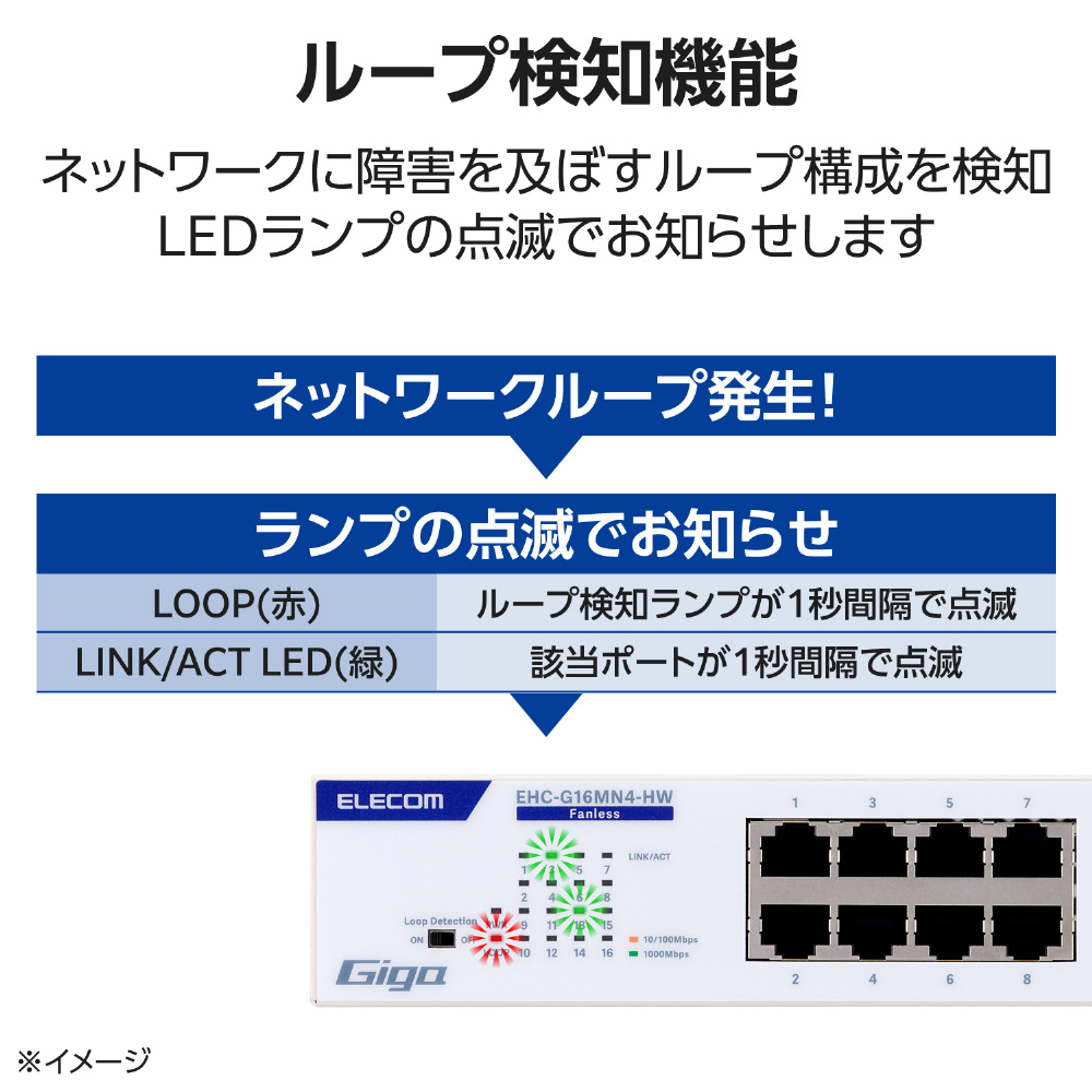 ループ検知機能を搭載しています。 LEDランプの点滅によりネットワークループ発生をお知らせし、ネットワーク障害の解消を促します。