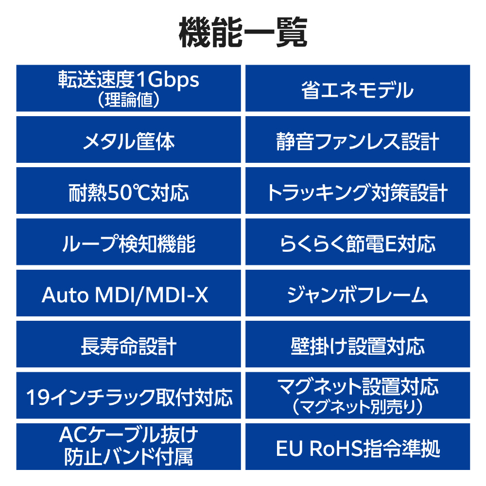 Giga(1000BASE-T)対応、電源内蔵のメタル筐体16ポートスイッチングハブです。 ストレート/クロスケーブルを自動判別する「Auto MDI/MDI-X」機能を全てのポートに搭載。接続ミスを防ぎます。