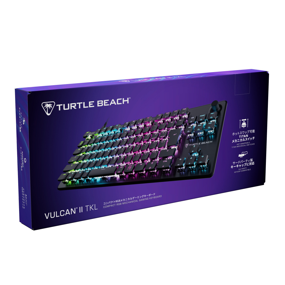 Turtle Beach Vulcan II TKLは、デスク上のスペースを有効活用しつつ、プレミアムなゲーミング性能を長時間にわたって発揮できるテンキーレスのメカニカルゲーミングキーボードです。