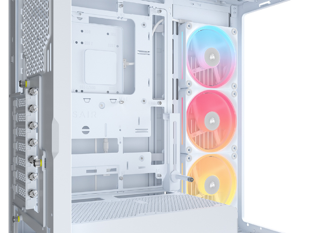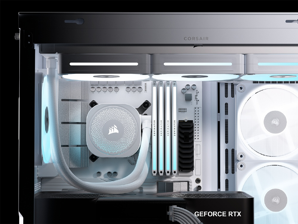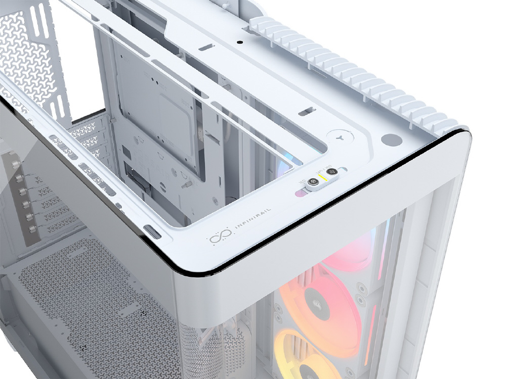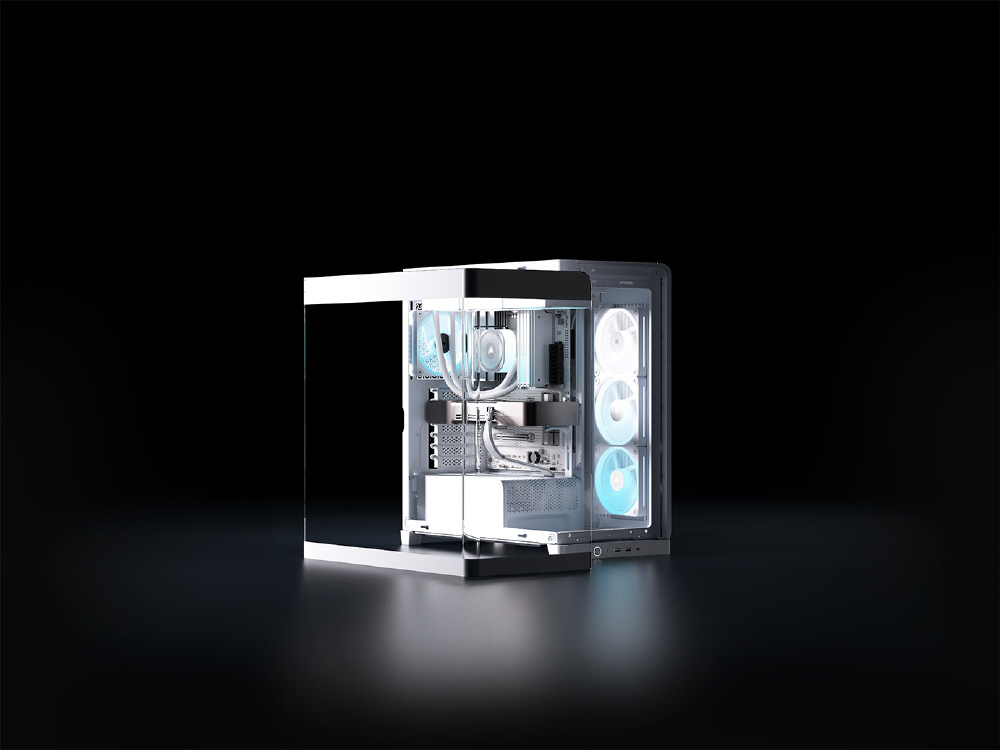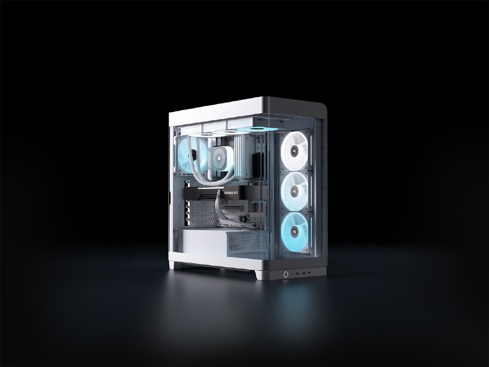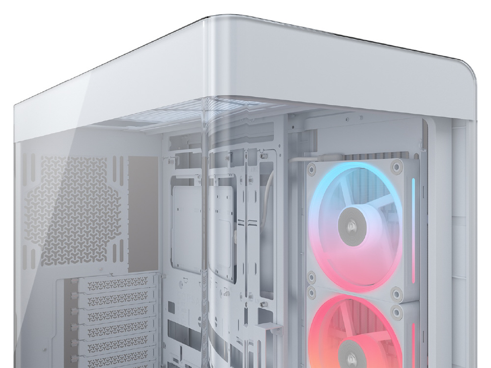 曲面強化ガラスパネルとInfiniRailシステムを採用。リバースローター設計のiCUE LINKファンを備えるミドルタワー型PCケース