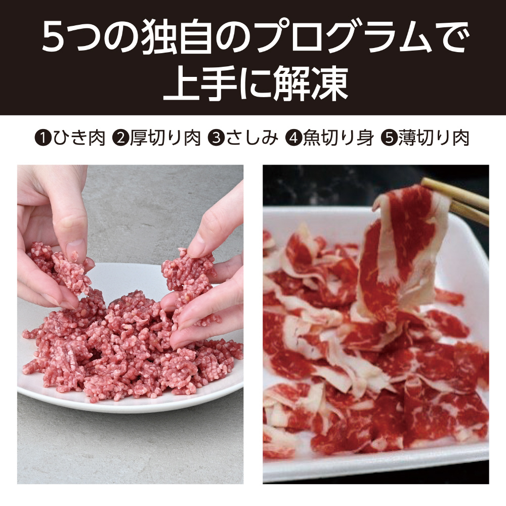 ※ひき肉・かたまり肉・さしみ・魚(切り身)・薄切り肉の5モードを選んでから解凍