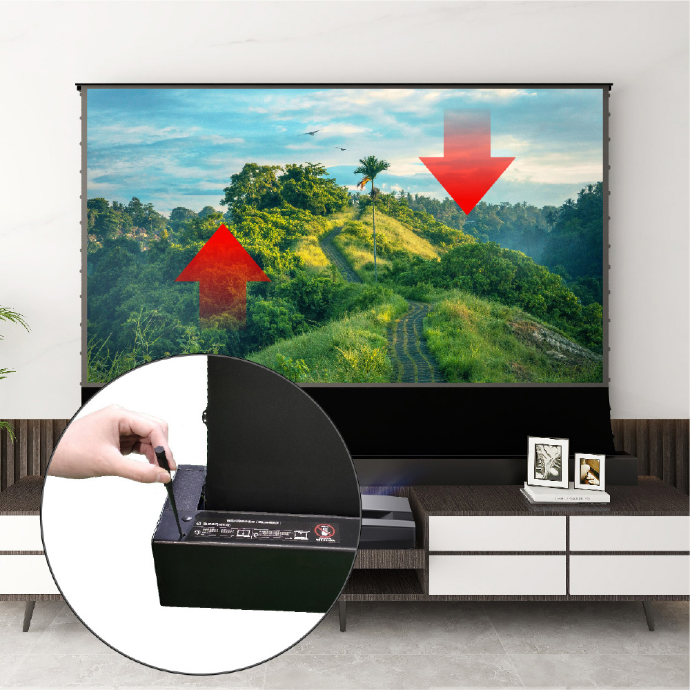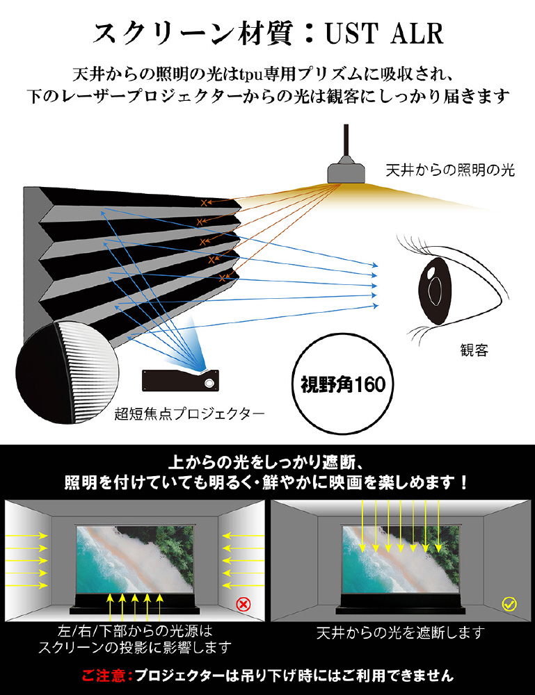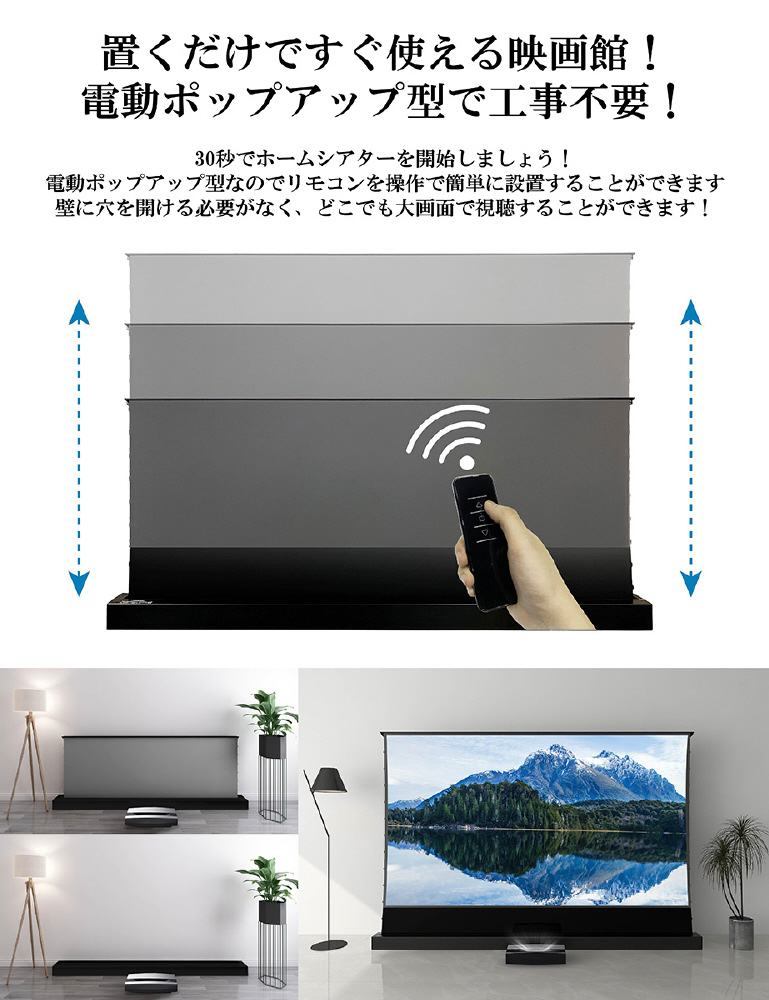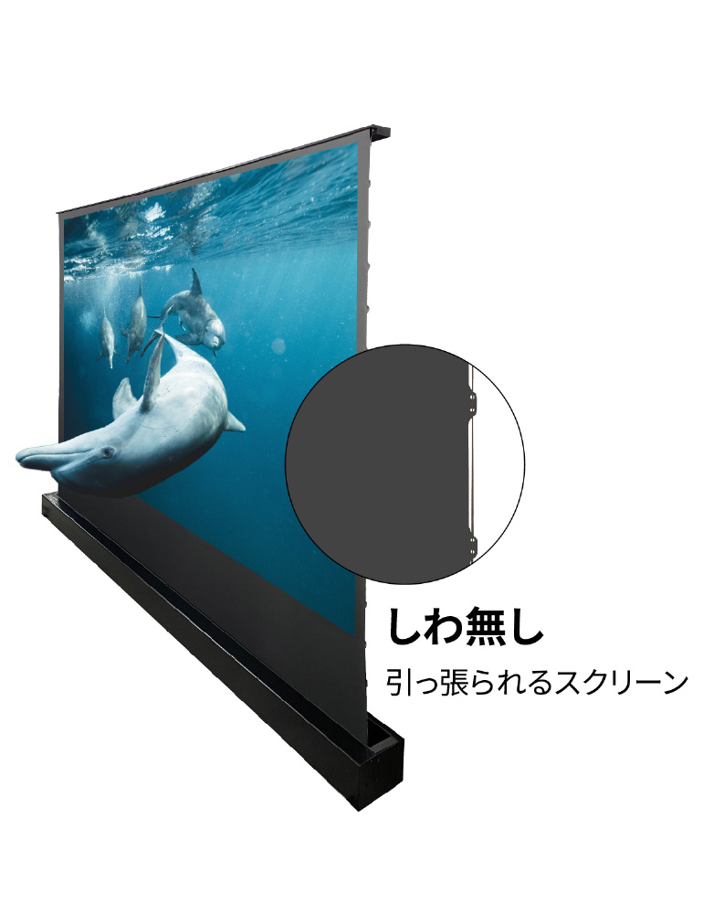 高輝度レーザー専用 超短焦点/長焦点 プロジェクタースクリーン 100インチ 16:9 環境光シャットアウト 電動ポップアップ型 ALR シワなし