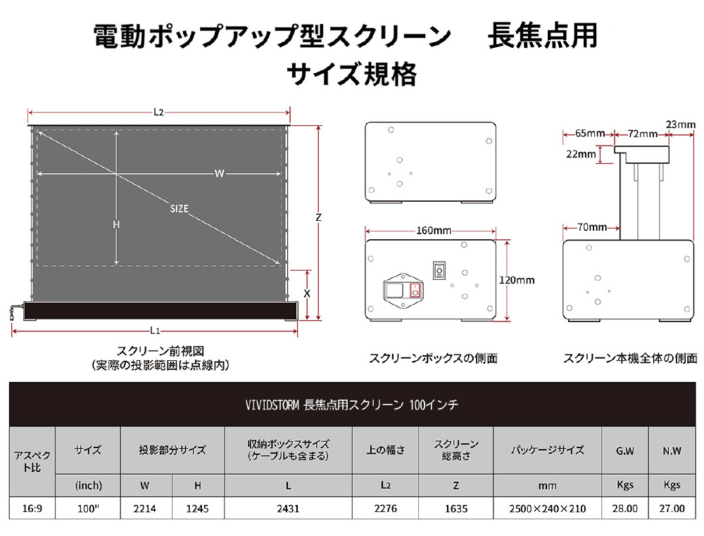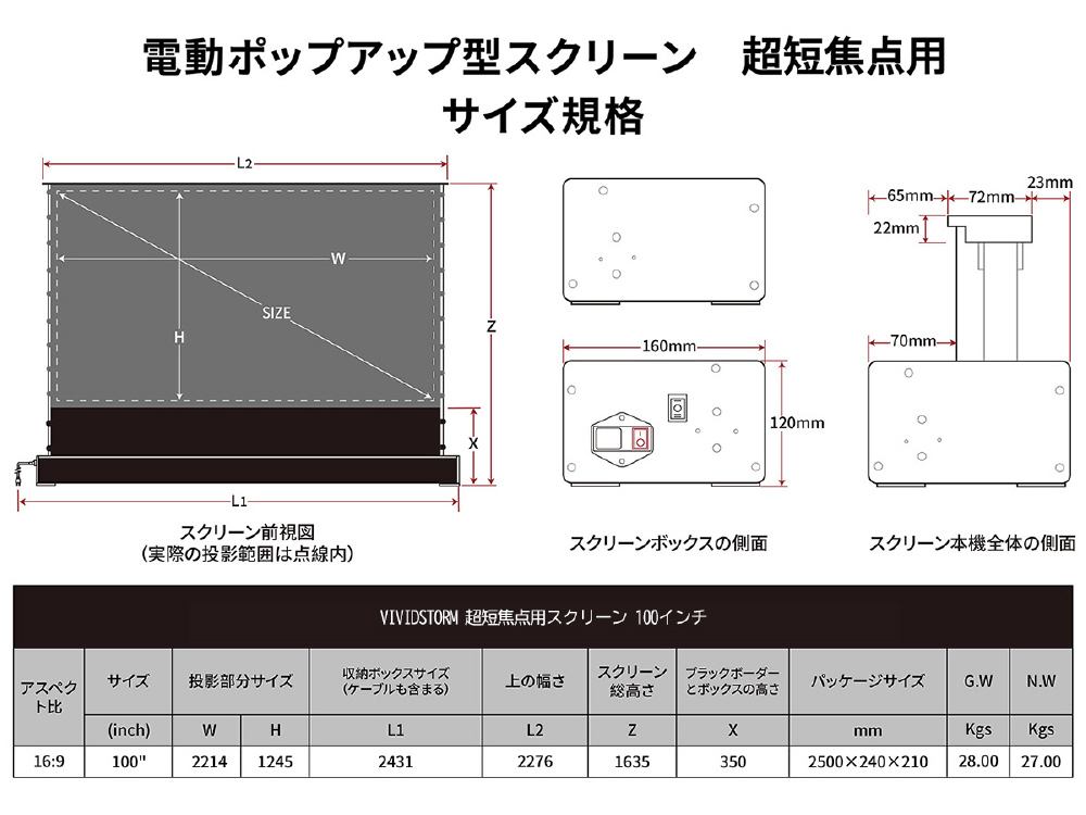 | 商品名 | 100インチ 高輝度レーザー専用 超短焦点/長焦点 プロジェクタースクリーン VSDSTUST100H-JP [電動] |