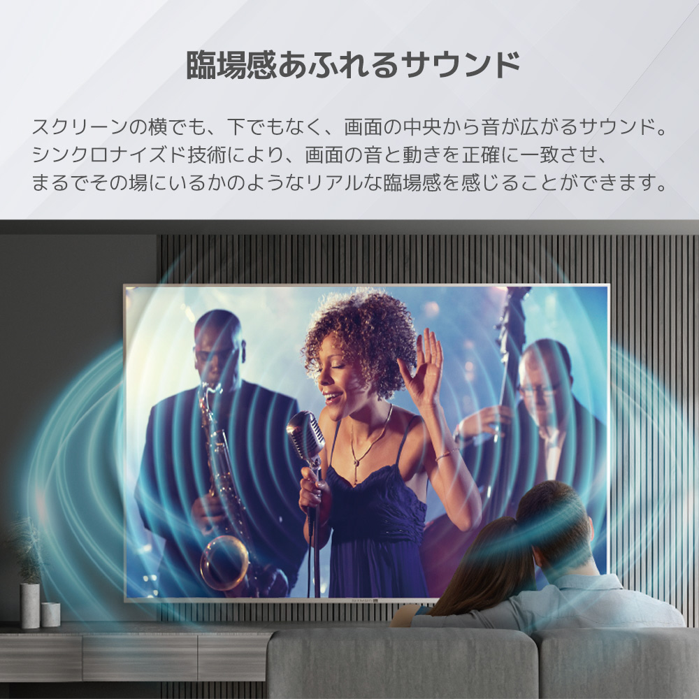 リアパネルの左・右・中央にスピーカーユニットを配置し、映像から直接音が発せられることで、映画館のような包み込まれる音響環境を再現し、圧倒的な没入感を実現します。