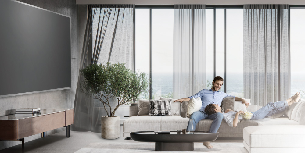 スクリーン表面に最先端の光学コーティング技術を採用し、環境光を遮断して鮮やかな色彩とリアルな奥行きを兼ね備えた高コントラストな映像を実現。