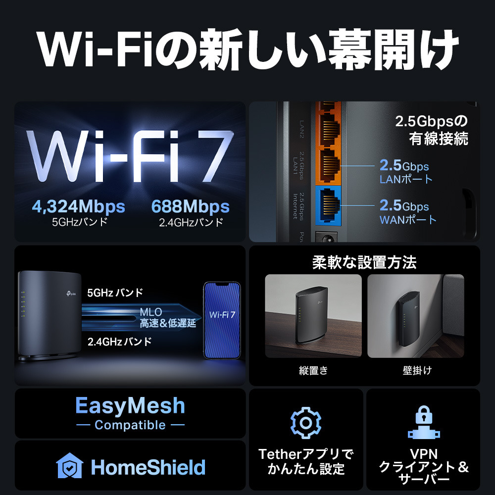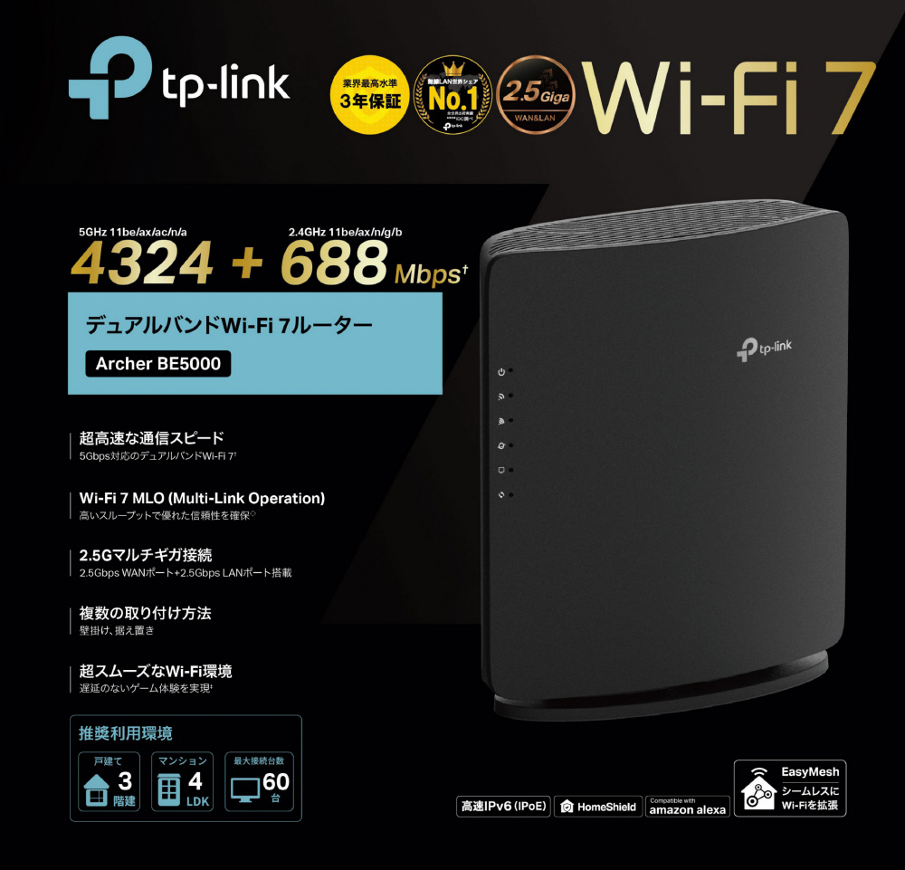 最大速度5Gbps、Wi-Fi 7で次世代の快適さへ。デュアルバンドWi-Fi 7ルーターArcher BE5000