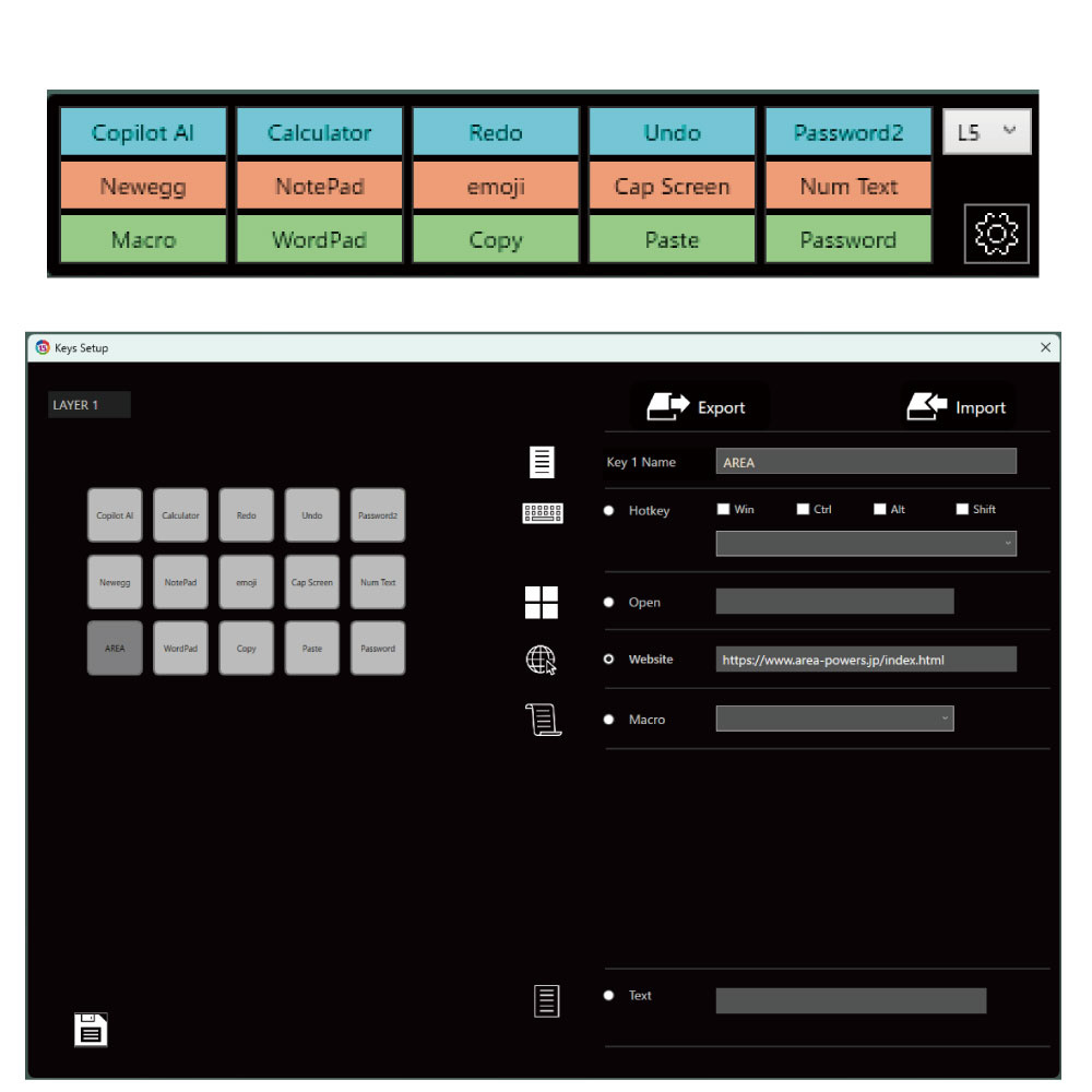 L1〜L9にはHot KeyやMacro、Websiteなど様々な機能を、Sレイヤーにはサウンドファイル再生設定を、Xレイヤーは誤作動防止用ブランクとして利用できます。