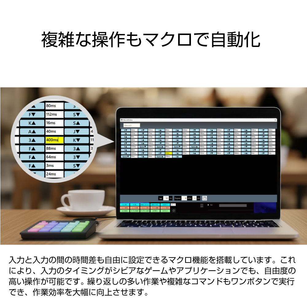 専用ソフトウェアで設定した機能をワンボタンで実行できるため、マウスやキーボード操作を減らし、作業効率を大幅に向上させます。