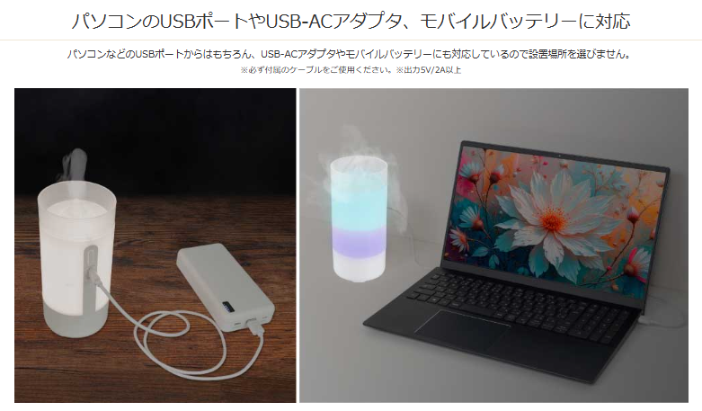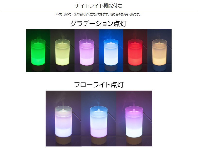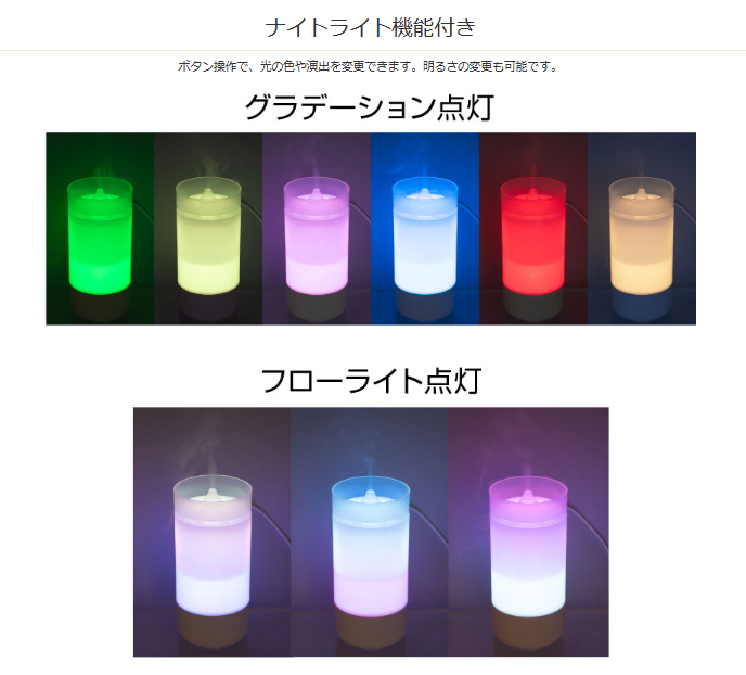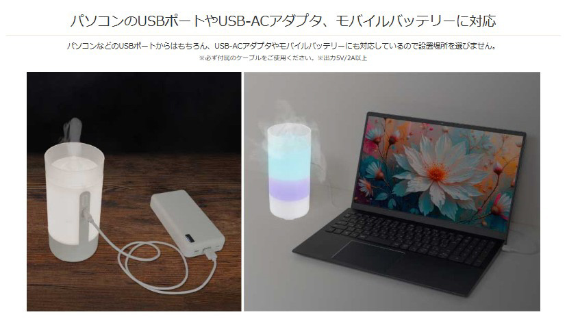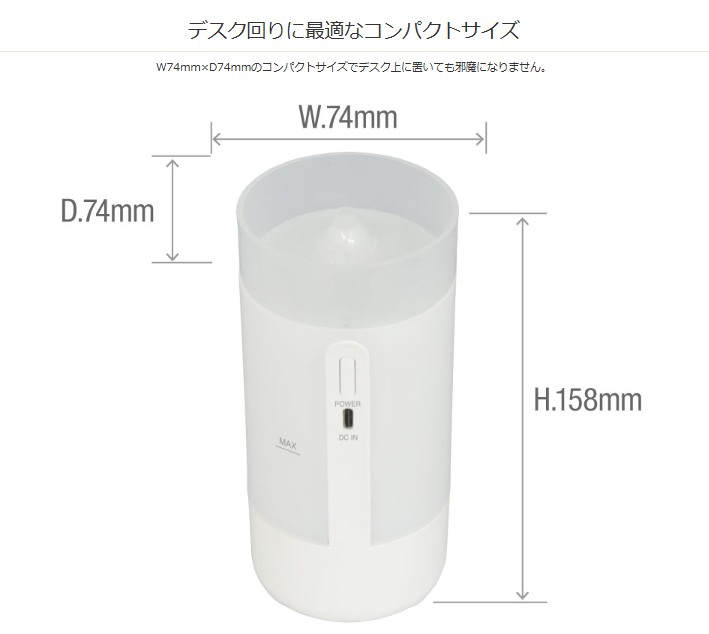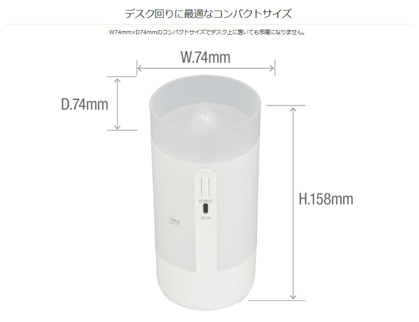 | 仕様2 | ●電源 DC5V/1A(USBポートより供給) ●タンク容量 125 mL ●動作モード 連続 ●連続加湿時間 約10〜11時間(ナイトライトOFF) ●ナイトライト あり ●空焚き防止機能 あり ●材質 PP ●RoHS 対応 |