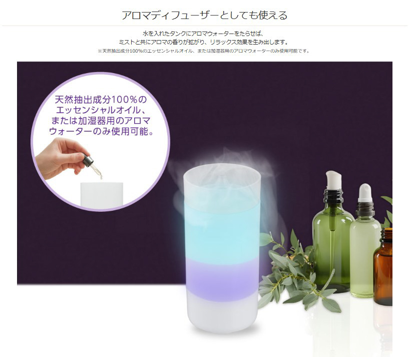 | 仕様1 | ※天然抽出成分100%のエッセンシャルオイル、または加湿器用のアロマウォーターのみ使用可能です。 |