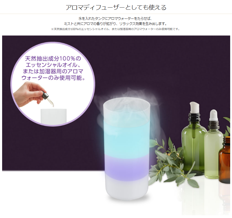 ※天然抽出成分100%のエッセンシャルオイル、または加湿器用のアロマウォーターのみ使用可能です。