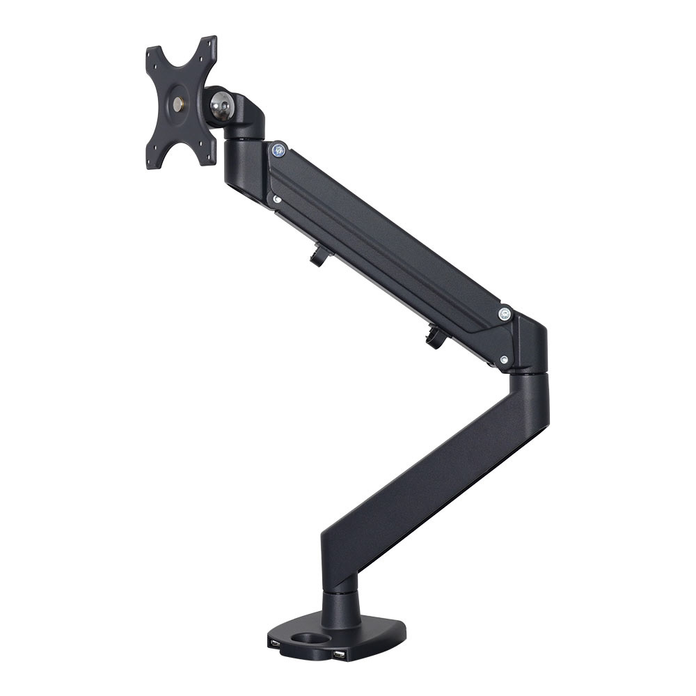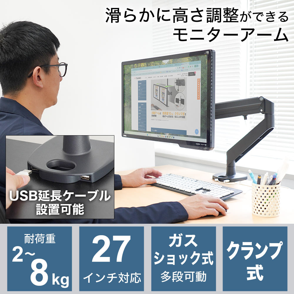 工具を使わずに高さ調整ができる、USB延長ケーブル設置可能なガスショック式モニターアーム1面タイプ