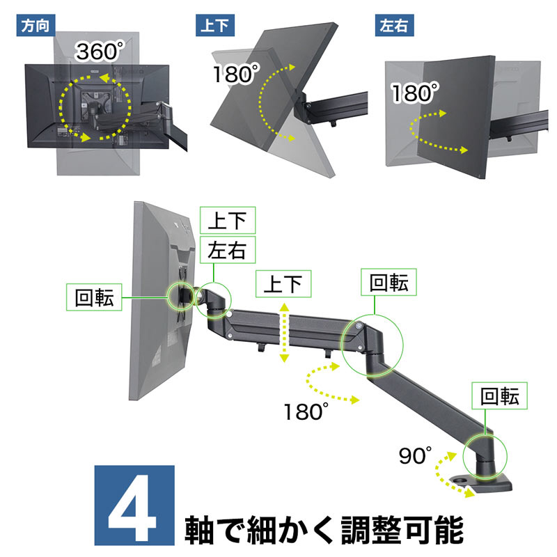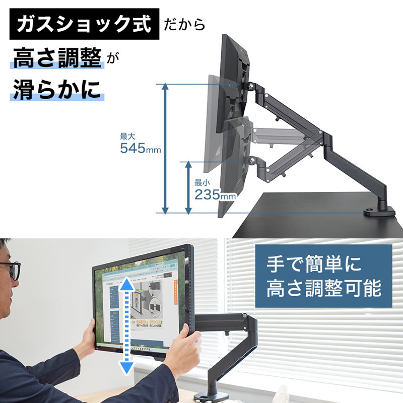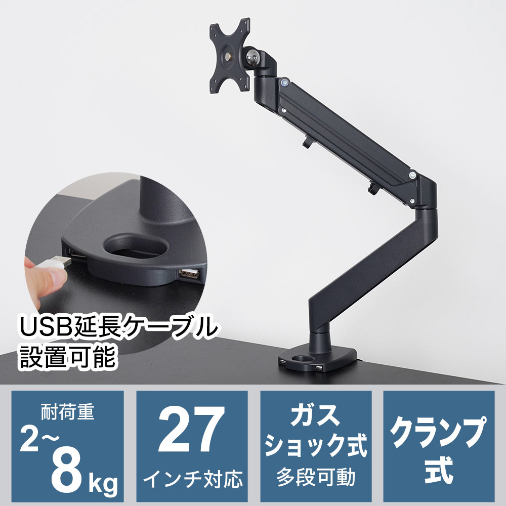 ■工具を使わずに高さ調整ができる、USB延長ケーブル設置可能なガスショック式モニターアーム1面タイプ