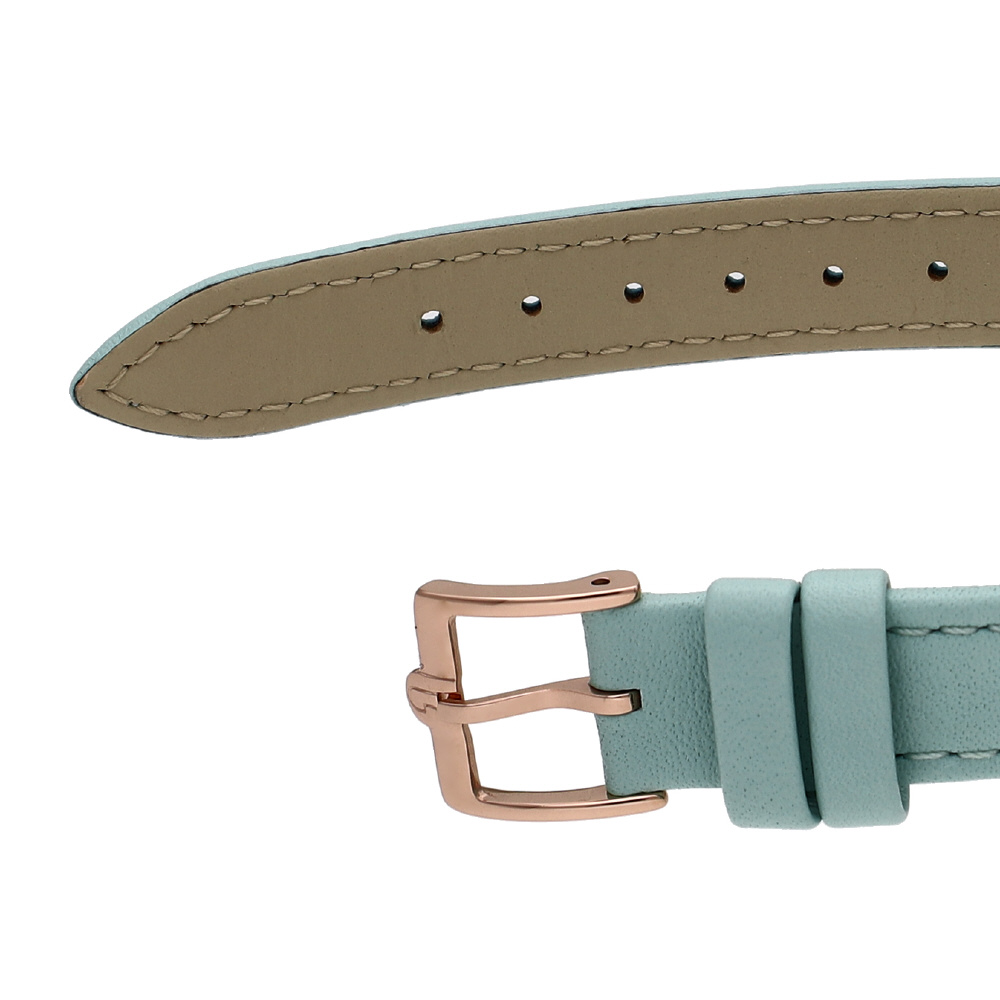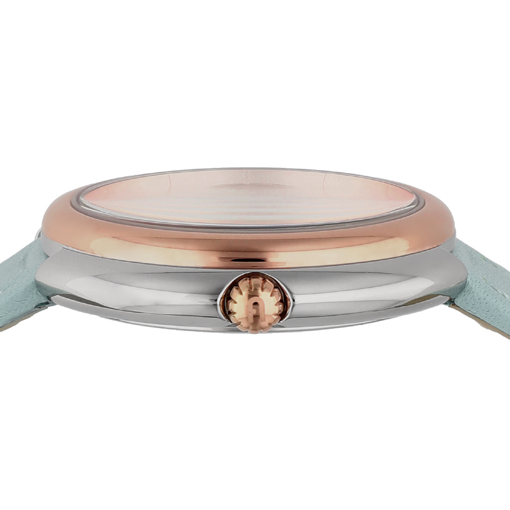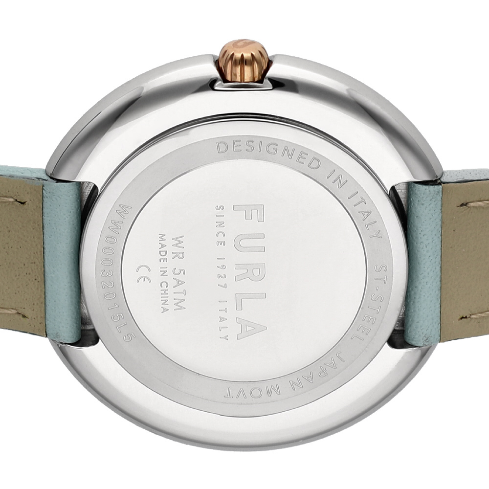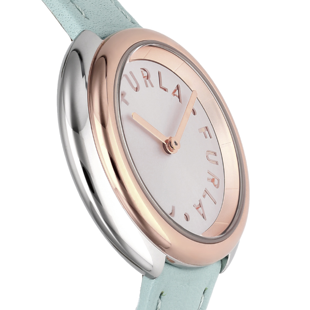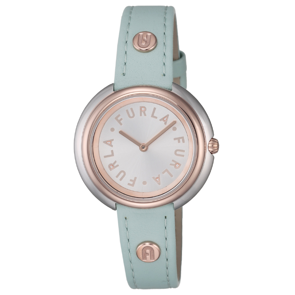 丸みを帯びた小ぶりのラウンドケースに、フルラのブロックロゴを配したミニマルなダイヤル、ミントカラーのレザーベルトを組み合わせた、都会的で上品な1本。