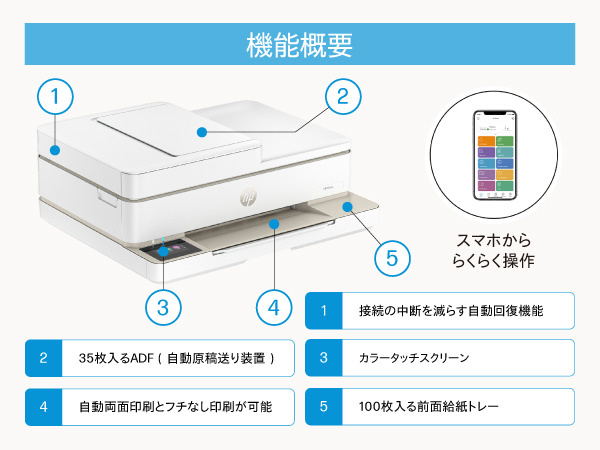 | 給紙容量 | 普通紙100枚、ADF35枚、封筒10枚、はがき40枚 |